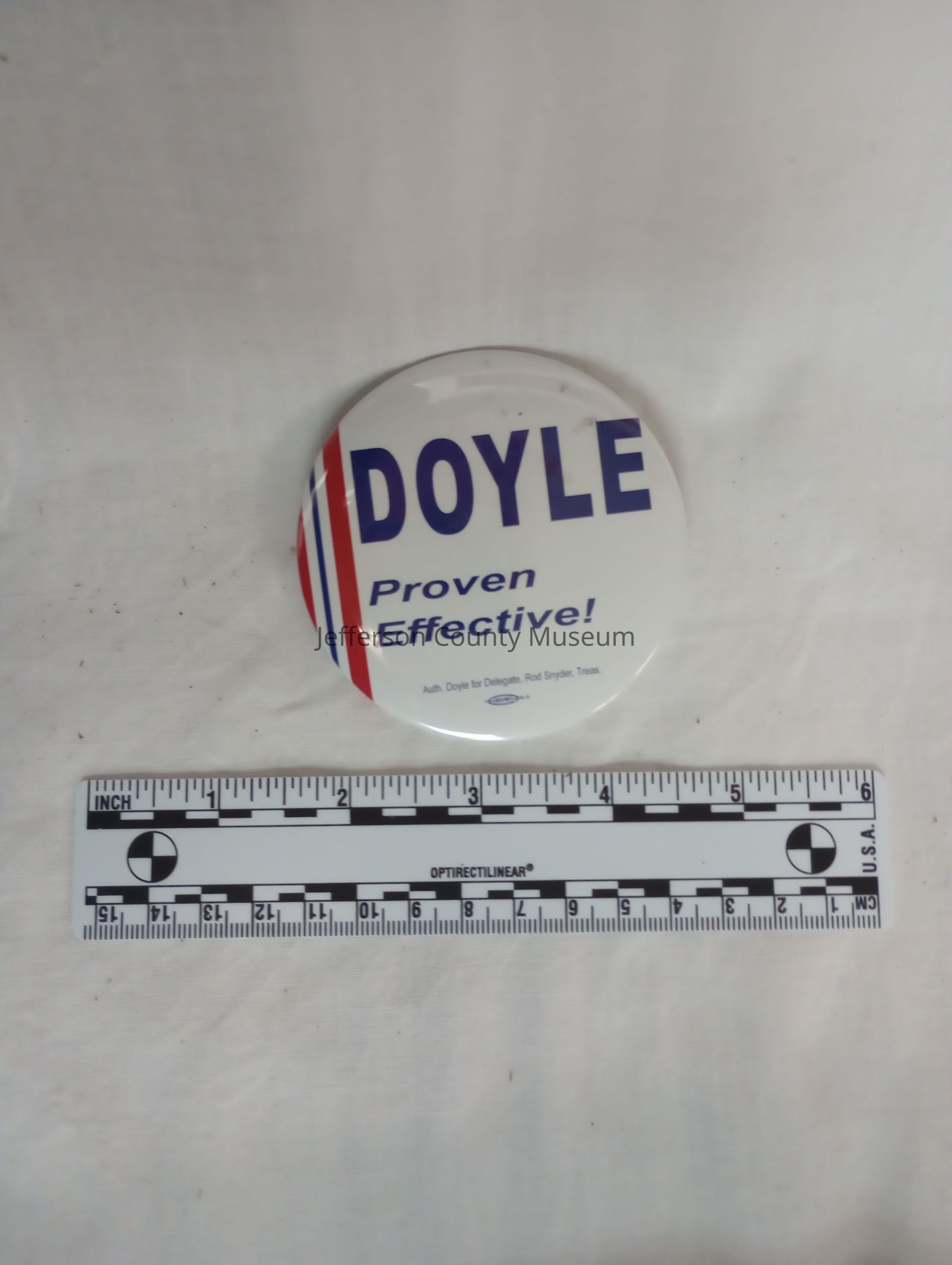 Circular white button with red and blue stripes and the blue text "DOYLE Proven Effective!/ Auth. Doyle for Delegate, Rod Snyder, Treas."Context