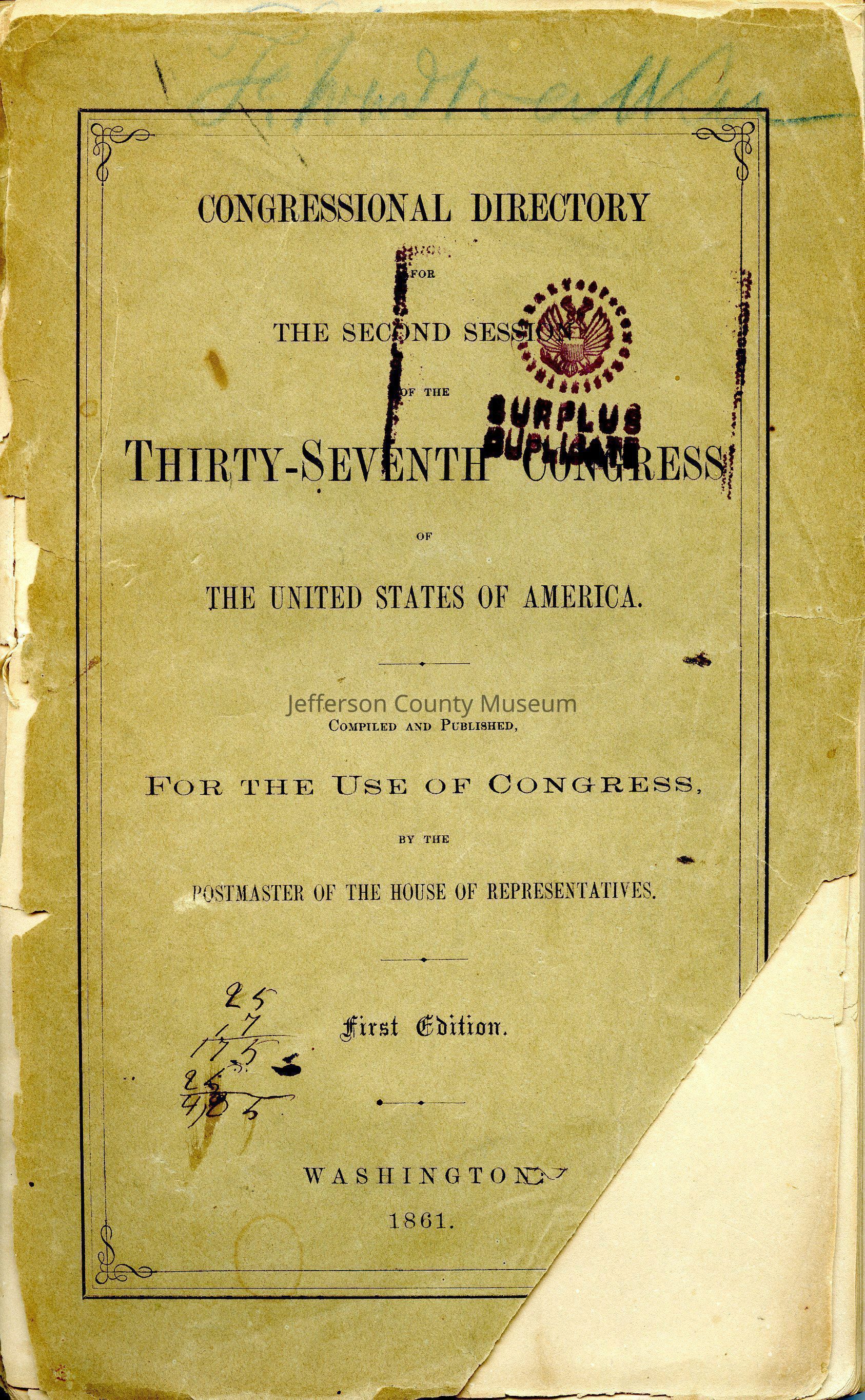 Congressional Directory for the Second Session of the Thirty-Seventh Congress of the United States of AmericaEntry/Object ID