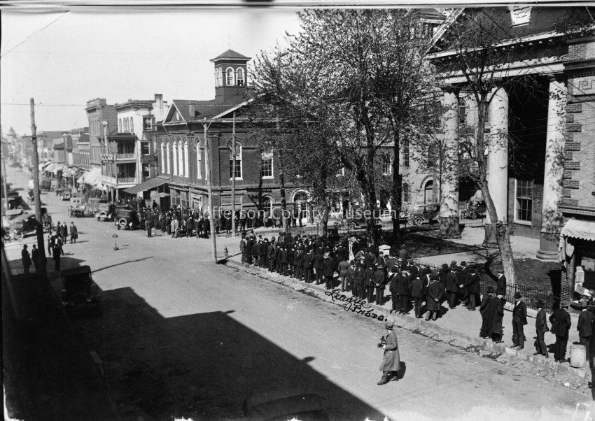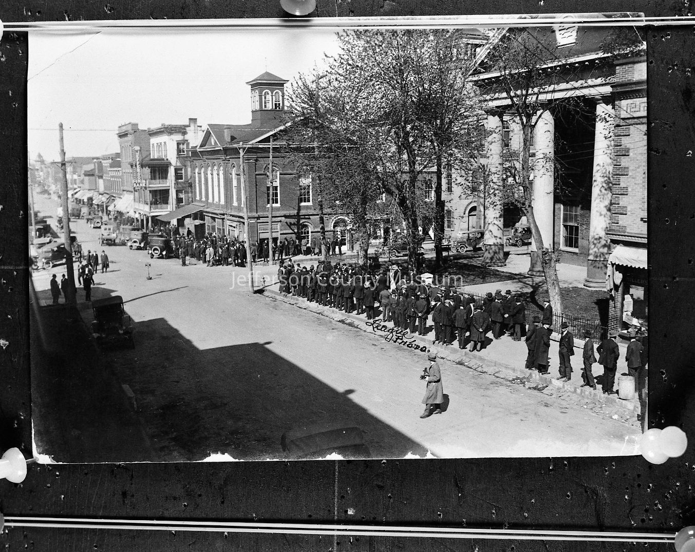 Miners' trial, group outside Jefferson County Court House [copied from old photo 1967 and originally from a League Studio lantern slide]
