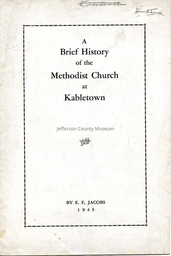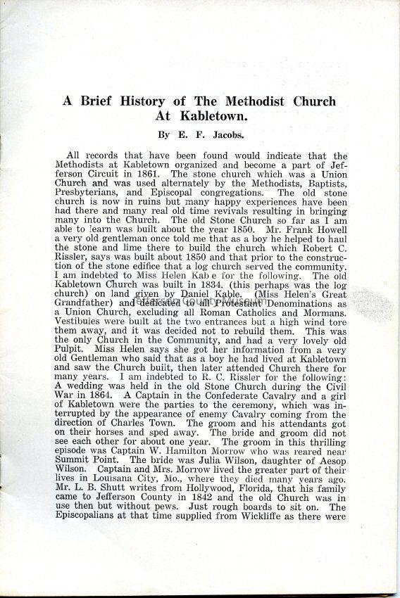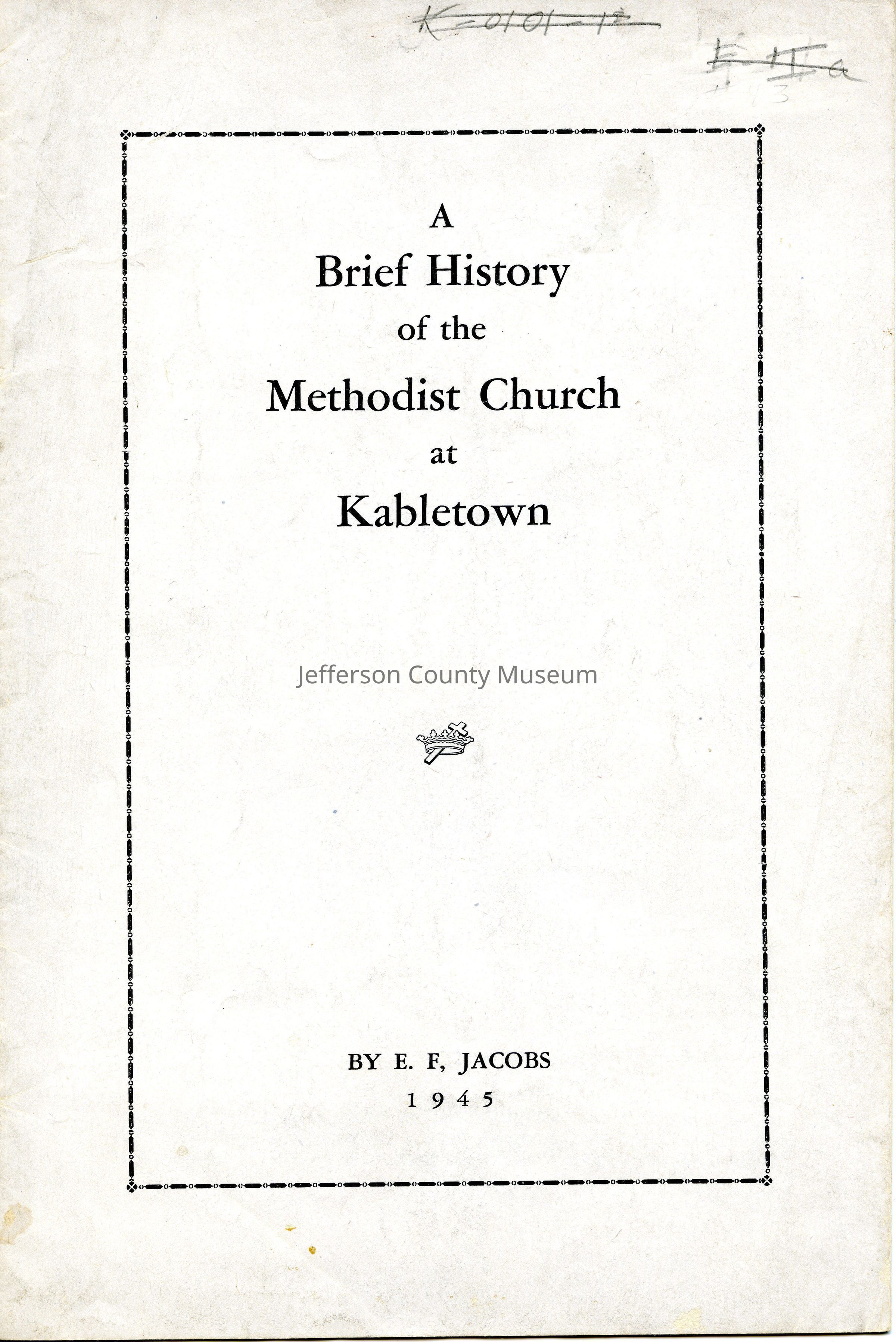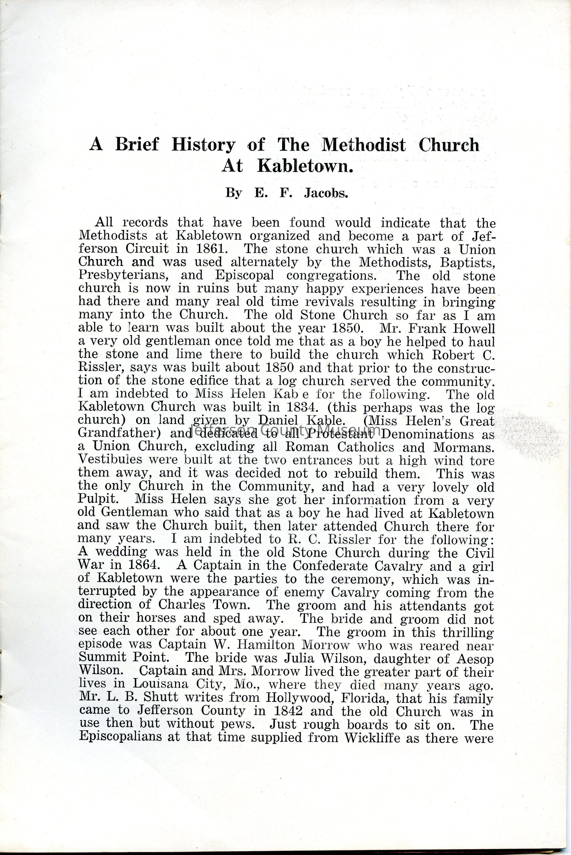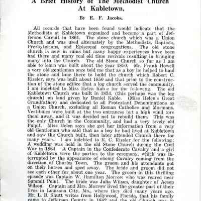 A brief history of the Methodist Church at Kabletown. Includes lists of pastors of the church since its founding circa 1861.Acquisition
