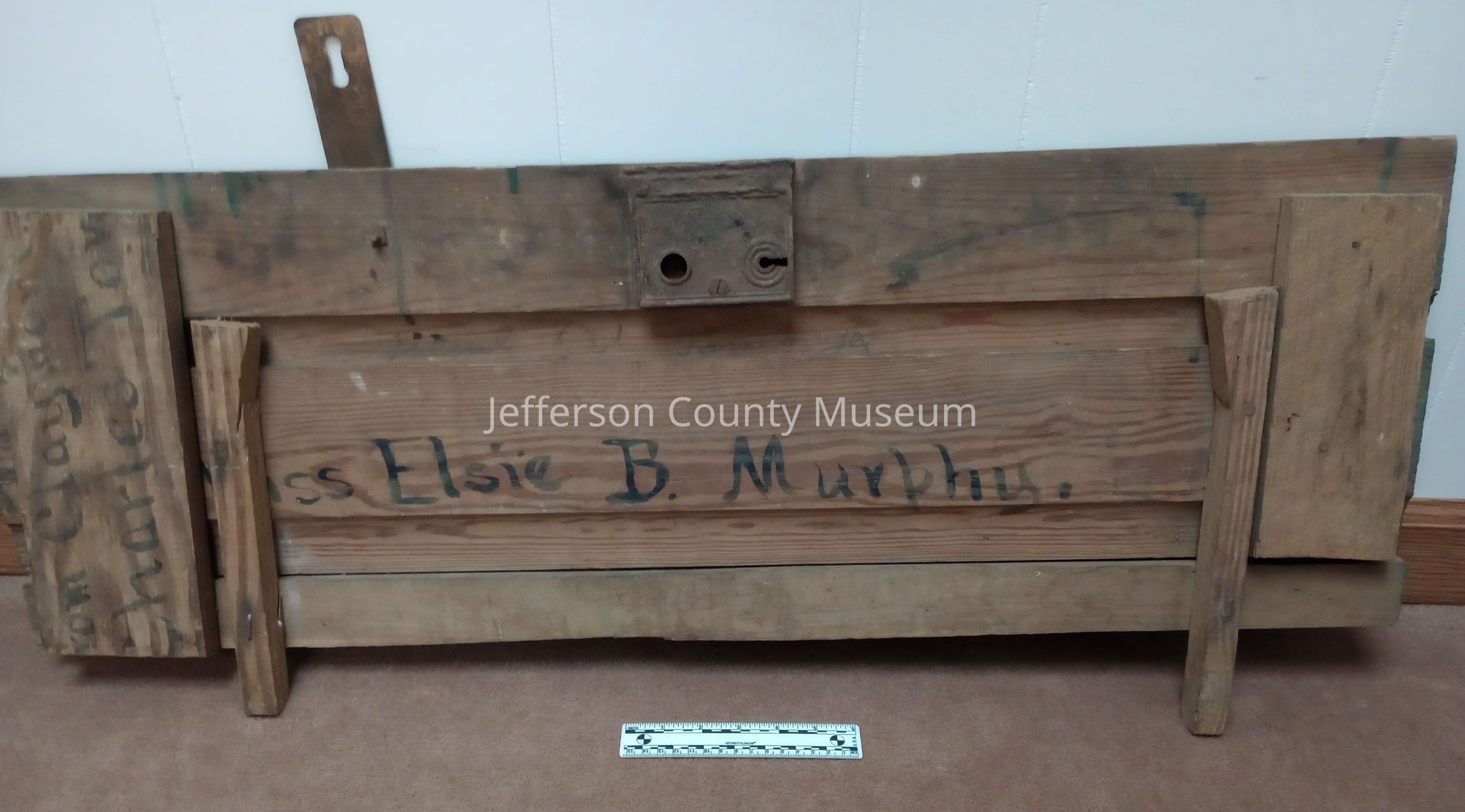 Wooden panel made from scraps, including part of a door with a lock still intact. Used as a shipping container by Elsie Murphy. The words "Miss Elsie B. Murphy" and "From Claymont", "Charles Town" are painted onto one side. Written in pencil on the same side is "Special Oil Paintings", indicating what the container may have shipped.Context