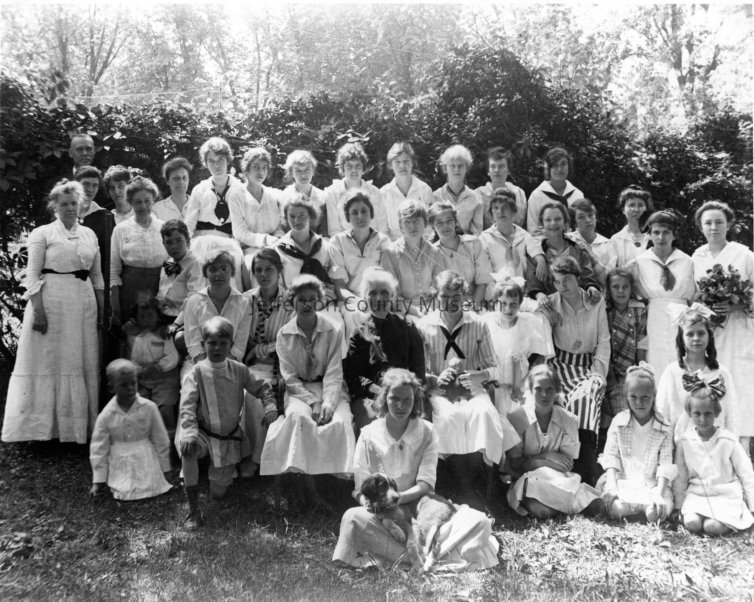 Large group of women and children, one man and one dog at (possibly) Stephenson's Seminary with Mr. and Mrs. Campbell.Acquisition