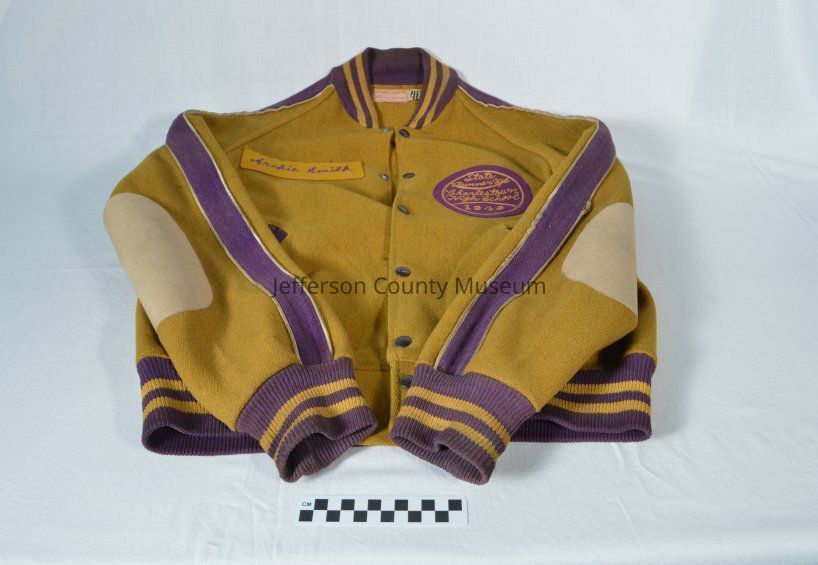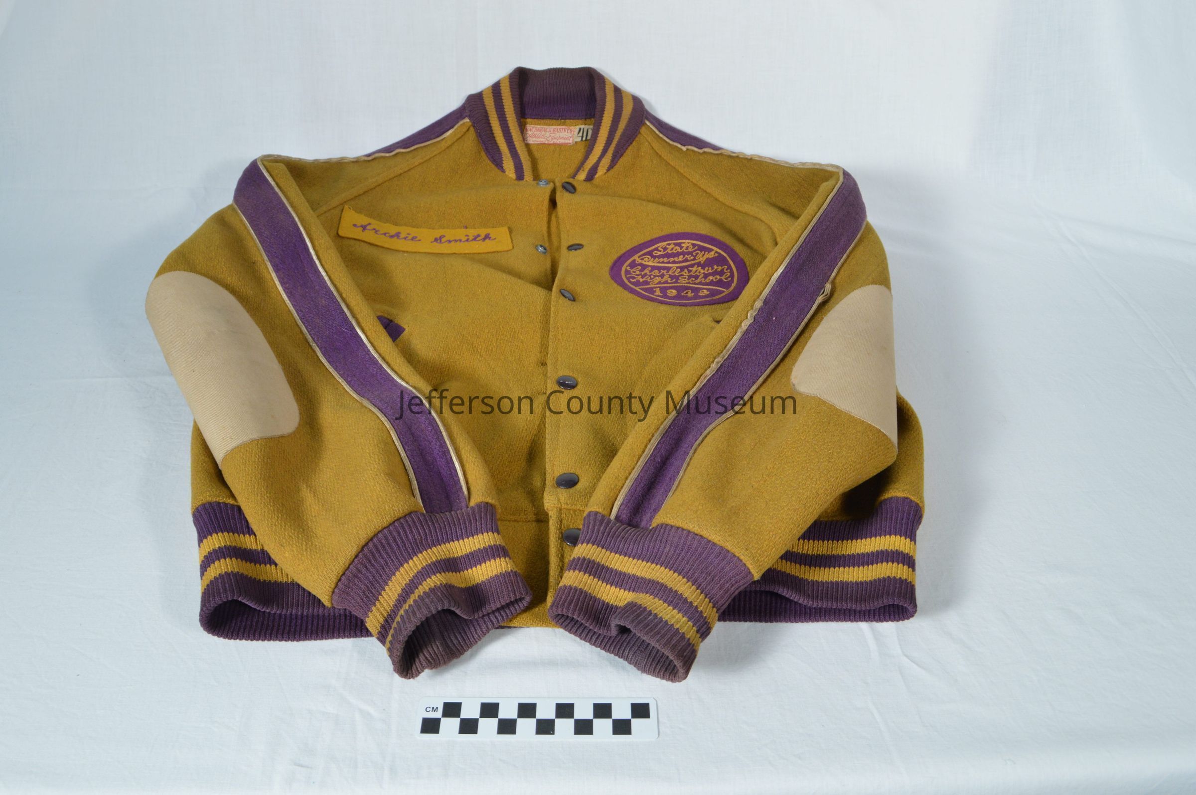 Gold baseball jacket with purple detailing. Circular patch of purple fabric with gold thread shaped in the form of a baseball on front left of jacket reads: "State Runner Ups, Charlestown High School, 1948." Rectangular piece of fabric with "Archie Smith" written in purple thread sewn onto front right of jacket by Archie Smith. Tan elbow pads. Tag inside jacket reads: "Bacharach-Rasin Co. Athlethic Equipment, 14 N. Howard St. Baltimore."