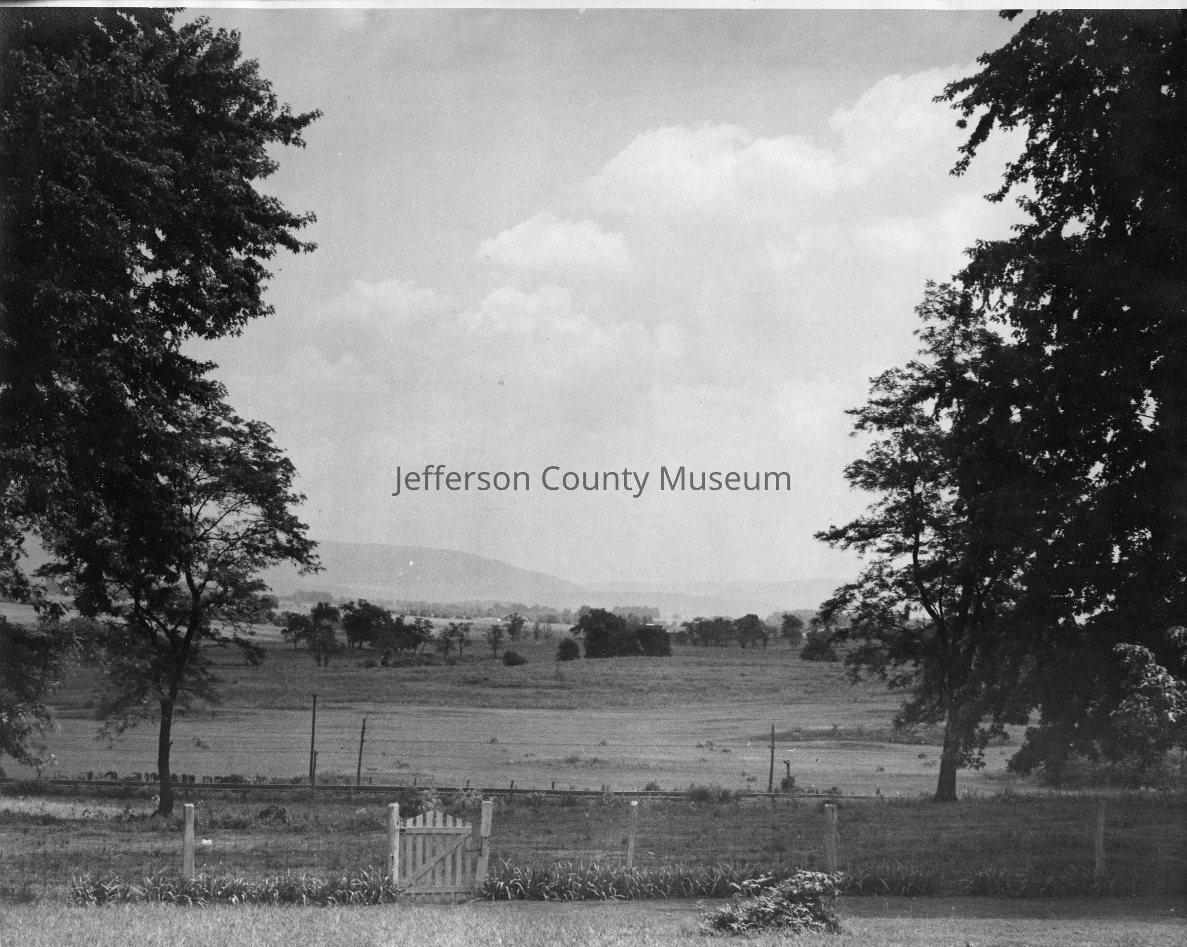 Part of a photo album. Text below photo reads: " Main House overlooks this view of the Blue Ridge Mountains of Maryland (left) and Virginia (right). The center is the Harper's Ferry Gap of West Virginia. "Acquisition