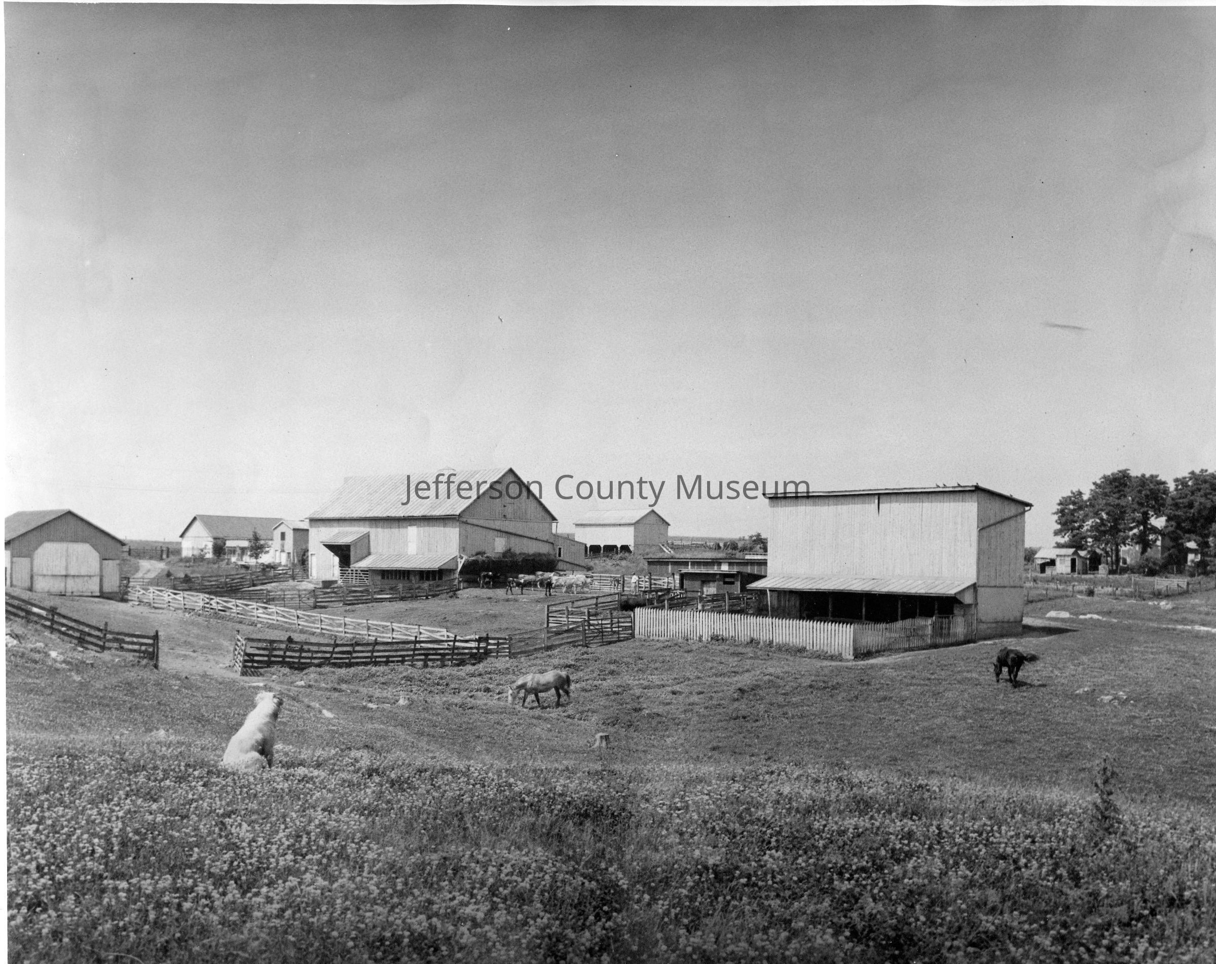 Part of a photo album. Text below photo reads: " All buildings especially designed and built for the operation of a "STOCK FARM" raising pure bred beef cattle, hogs, sheep, etc. 232 1/2 acres of exceptionally fertile land in extremely high state of cultivation. 35 acres Alfafa in it's second year. Excellent Blue Greass with electrically operated watering troughs and beautiful grove of oaks to provide shade. Wells (4) over entire farm provide water whereeever it is desired. "Acquisition