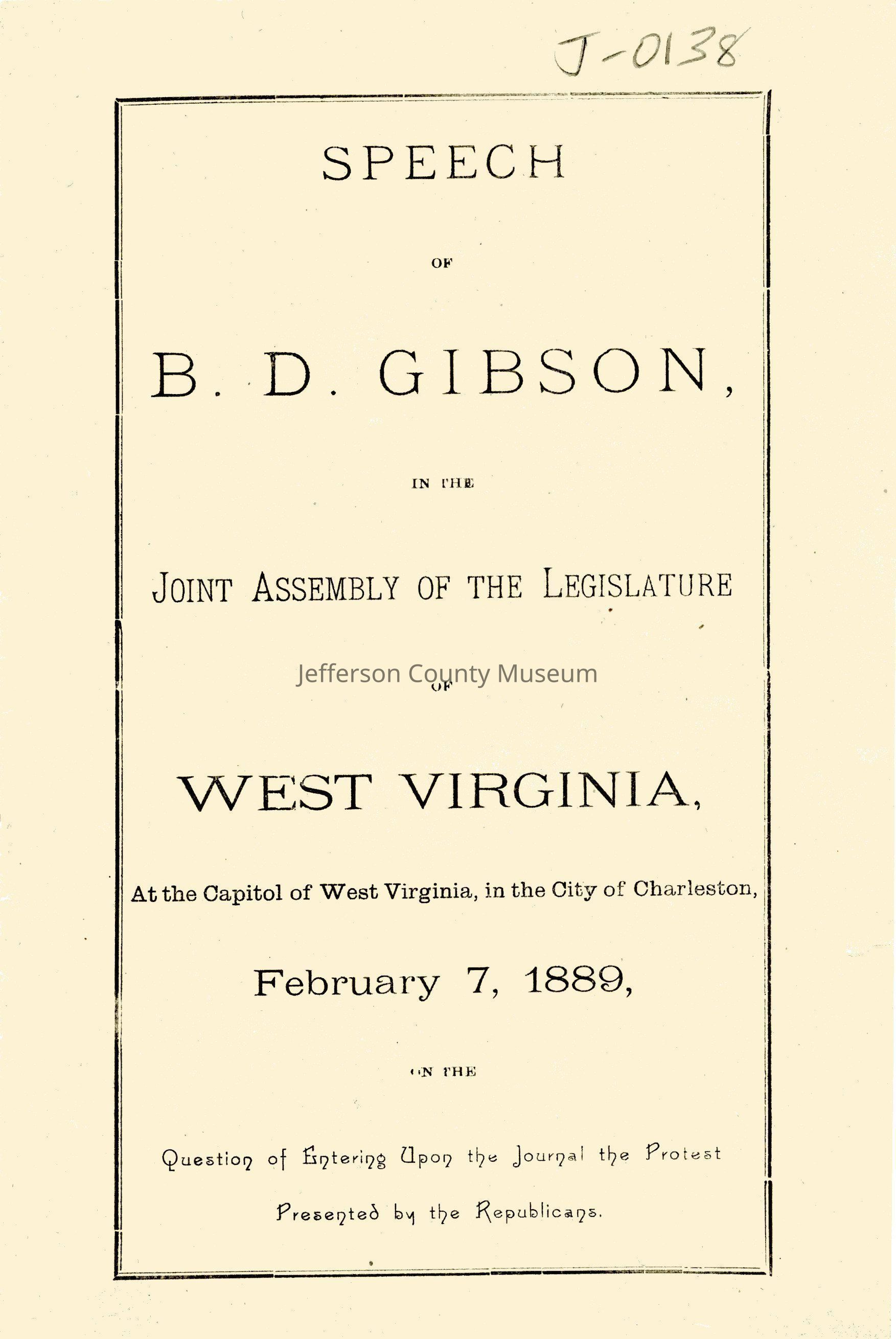 Speech of B. D. Gibson in the Joint Assembly of the Legislature of West Virginia at the Capitol of West Virginia, in the City of Charleston, February 7, 1889 on the Question of Entering Upon the Journal of protest Presented by the RepublicansEntry/Object ID