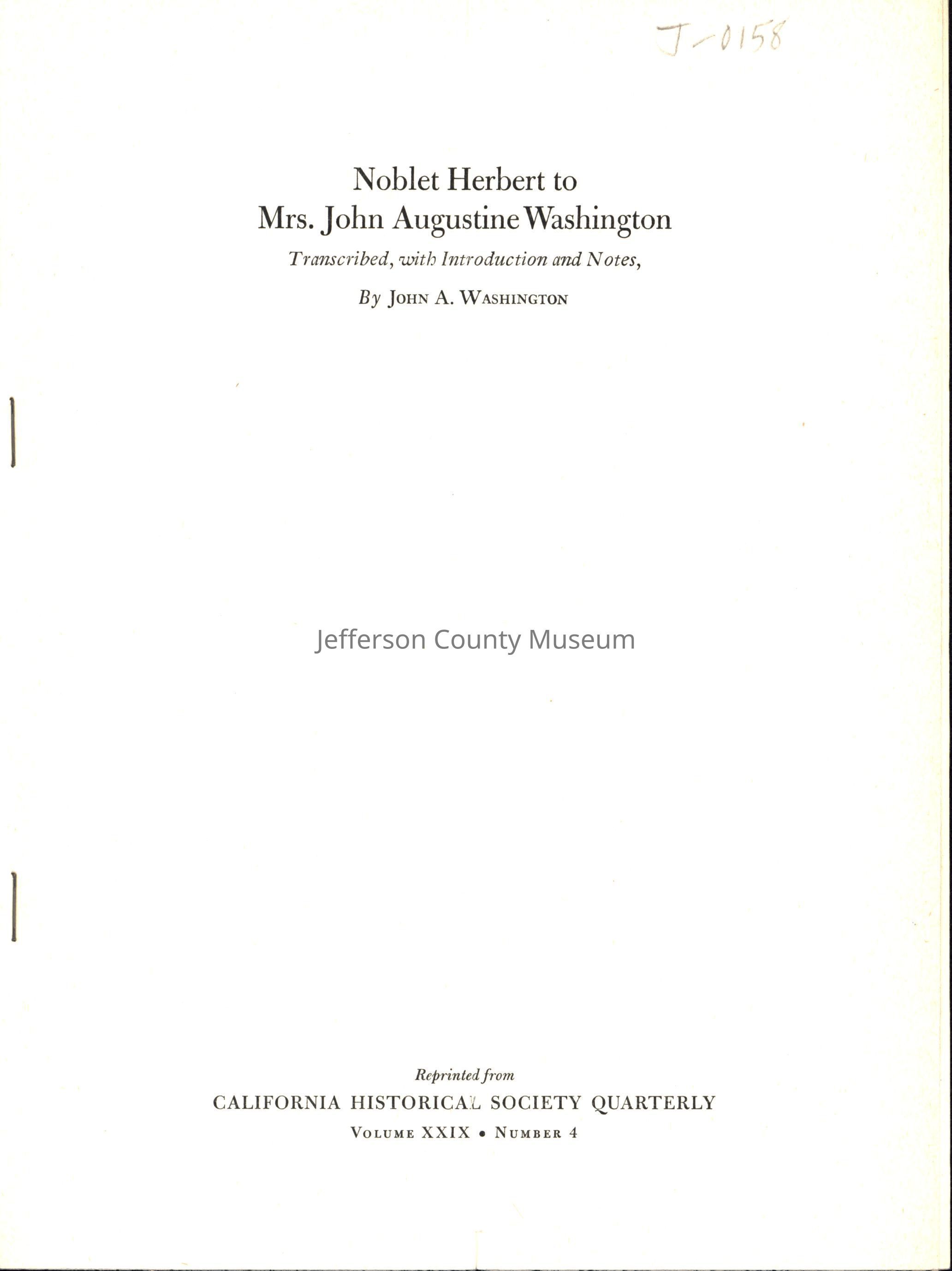 11-page reprint from the California Historical Society Quarterly, Vol. XXIX (4): 297-307 of an article titled: Noblet Herbert to Mrs. John Augustine Washington, Transcribed, with Introduction and Notes. Includes biographical information on Herbert and a transcription of a letter he sent December 27, 1850, to his aunt and foster mother, Mrs. Jane Washington at Blakeley in Jefferson County. In 1849 Herbert joined the Charlestown Mining Company to go to the California gold fields. The letter concerned some of his experiences there.