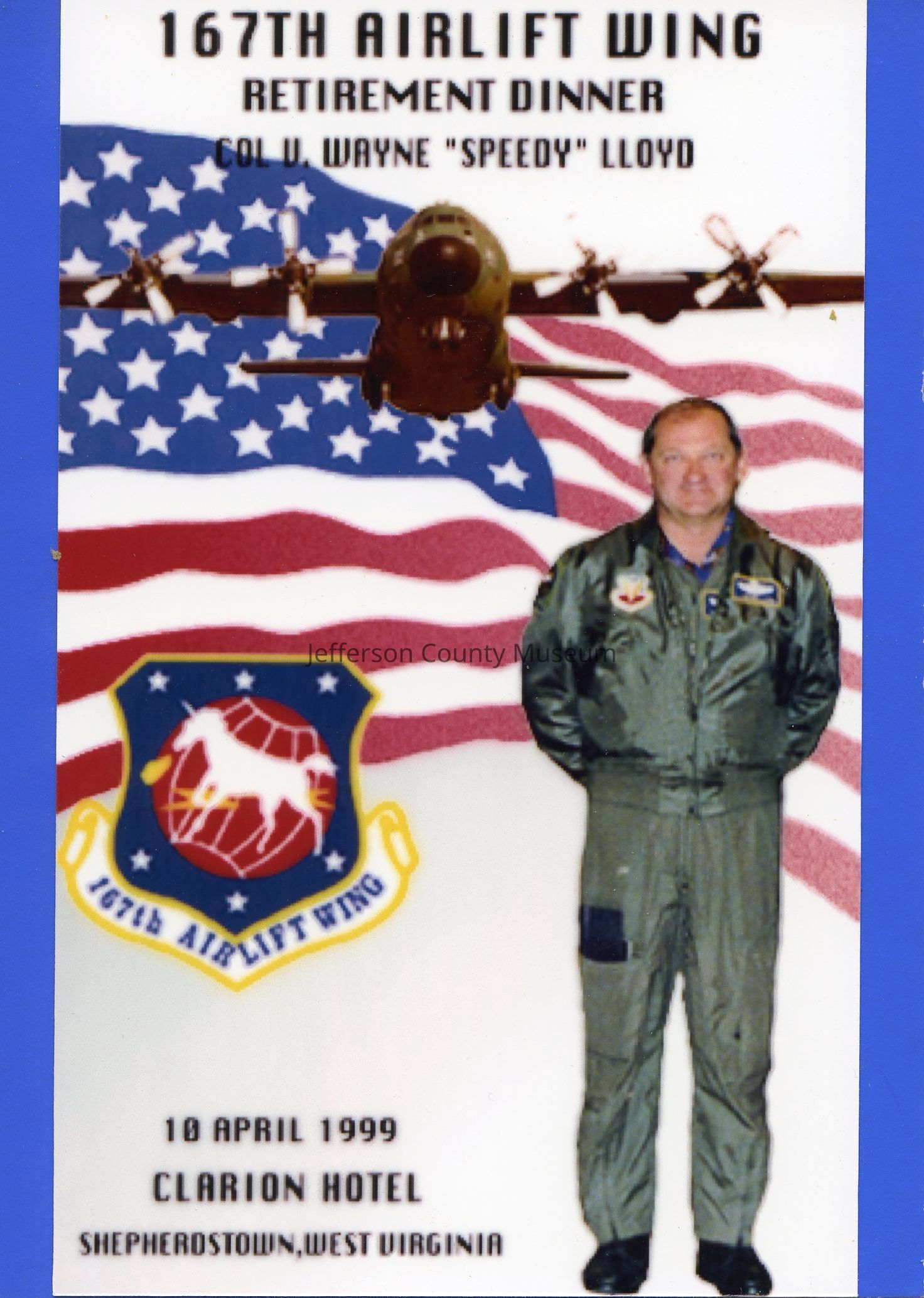 Announcement of 167th Airlift Wing retirement dinner for Col V. Wayne " Speedy " Lloyd, April 10, 1999, Clarion Hotel, Shepherdstown, West VirginiaAcquisition