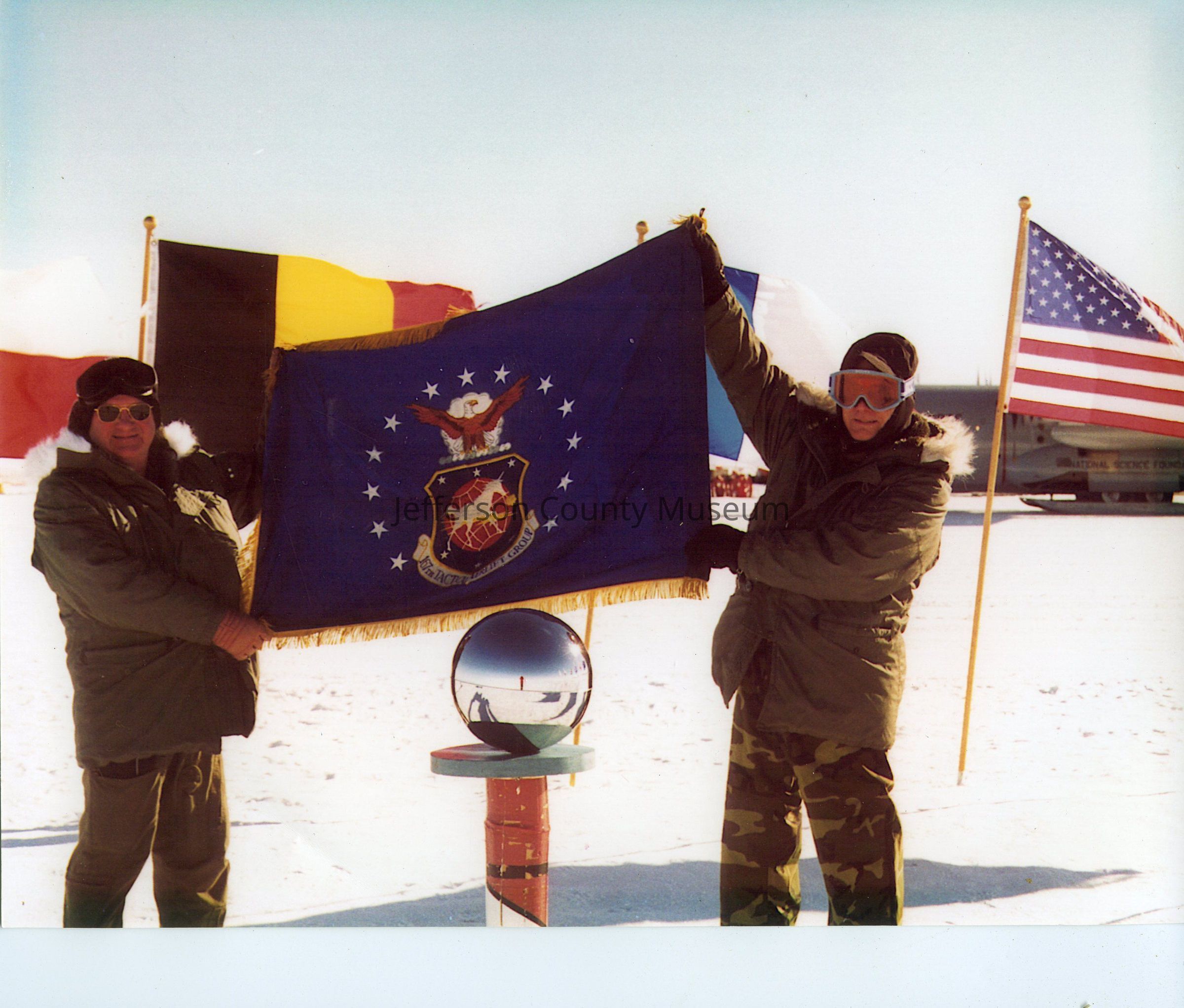 Wayne Lloyd and unidentified man holding banner of 167th Tactical Airlift Group in cold, snowy environment; National Science Foundation plane in backgroundAcquisition