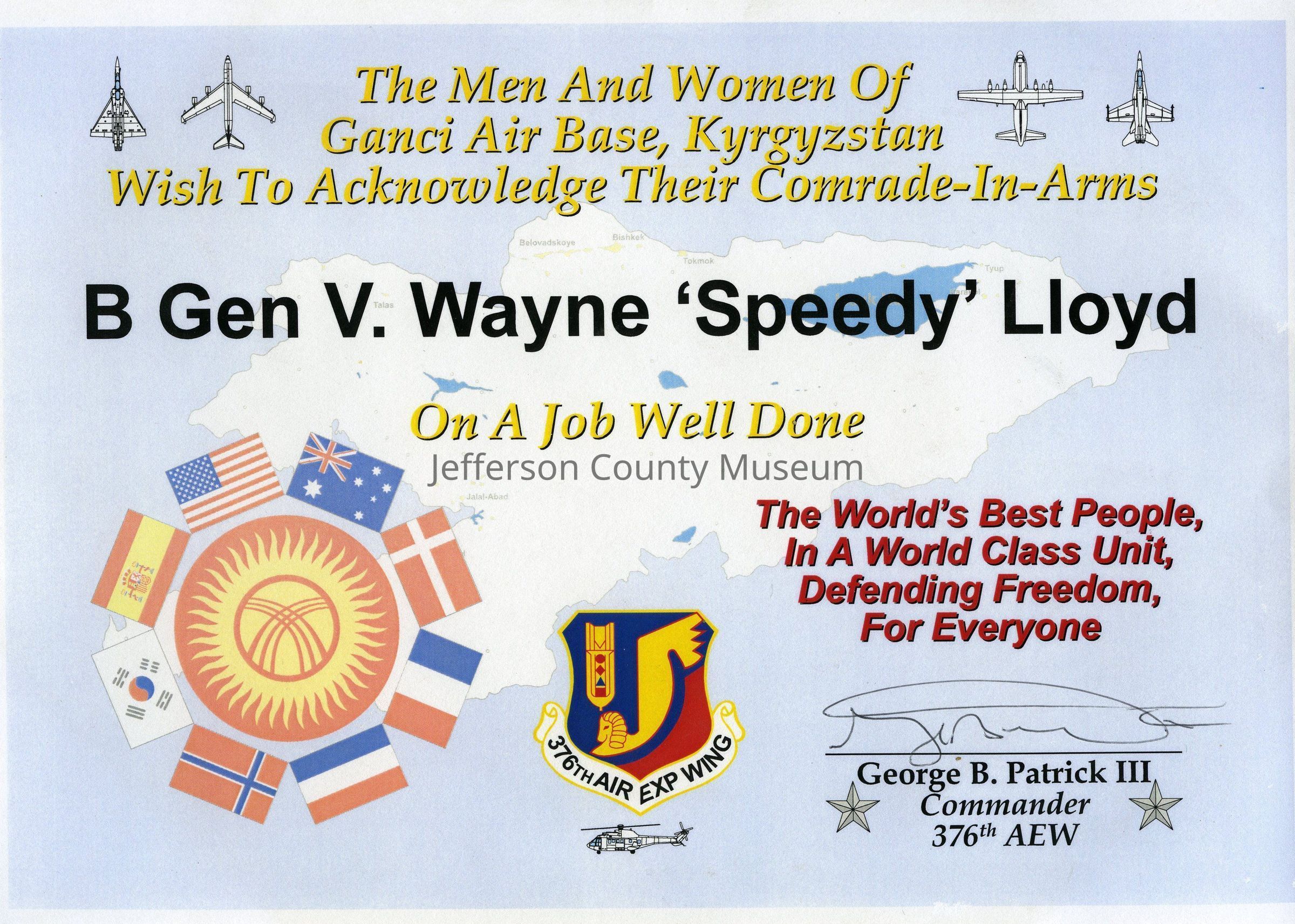 " The Men and Women of Ganci Air Base, Kyrgyzstan Wish to Acknowledge Their Comrade-In-Arms B Gen V. Wayne 'Speedy' Lloyd on a job well done, The World's Best People, in a World Class Unit, Defending Freedom, For Everyone, George B. Patrick III, Commander 376th AEW "Acquisition