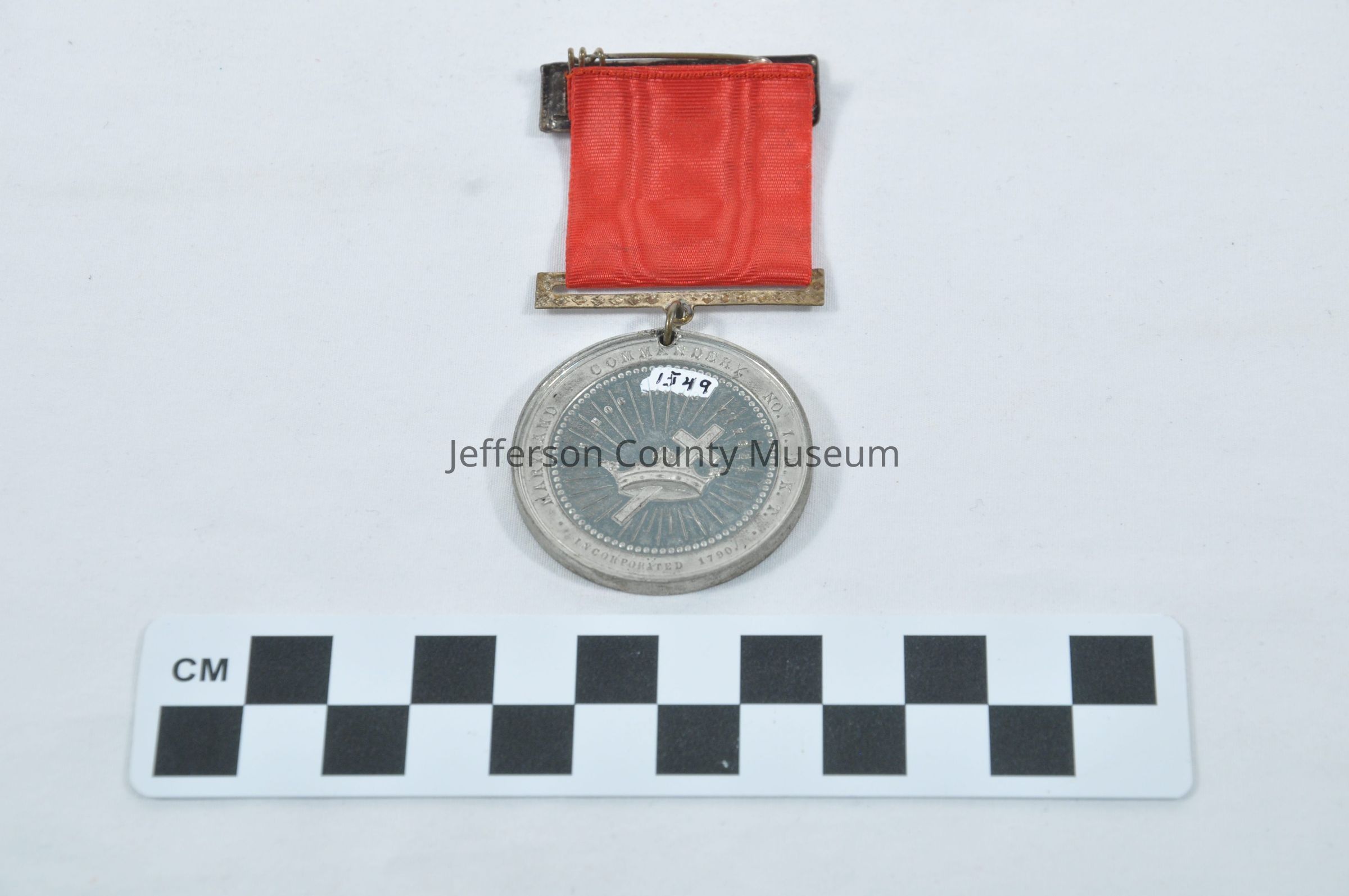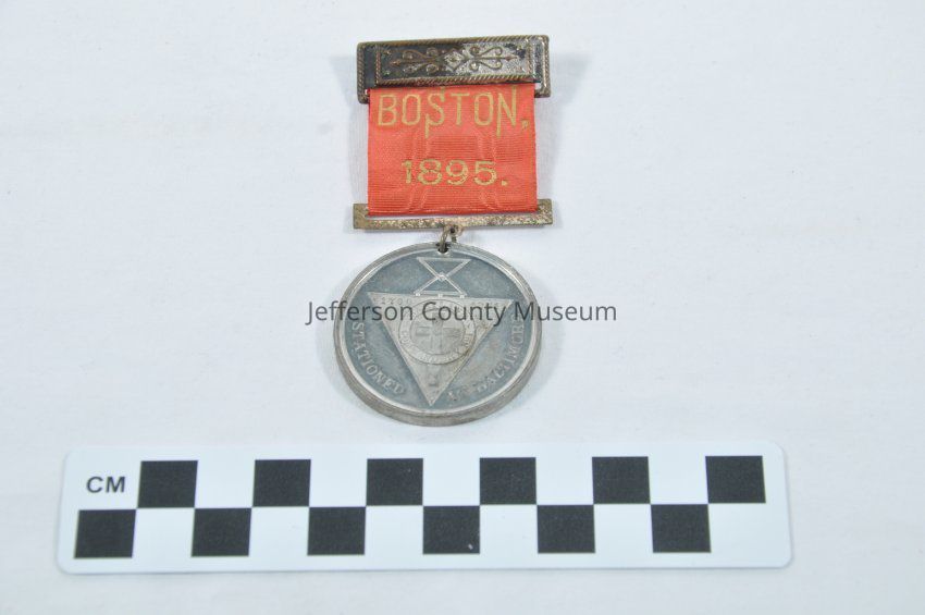 Medal is in three parts. The top is a metal bar with a red ribbon attached. The bottom of the ribbon is attached to a small bar with a silver colored round medal attached to it. The red ribbon says in gold letters "BOSTON 1895". The medal has two triangles together like an hourglass. Around the bottom half is "STATIONED AT BALTIMORE". In the center is an upside down triangle with "1790" in the left corner and "1871" in the right corner. In the center is a cross in a circle. Around the circle is "MARYLAND COMMANDERY NO. 1". The reverse of the medal has around it in a circle "MARYLAND COMMANDERY NO. 1. M. K. T. INCORPORATED 1790". In the center is a crown with a cross through it. Around the crown and cross is "IN HOC SIGNO VINCES".Acquisition