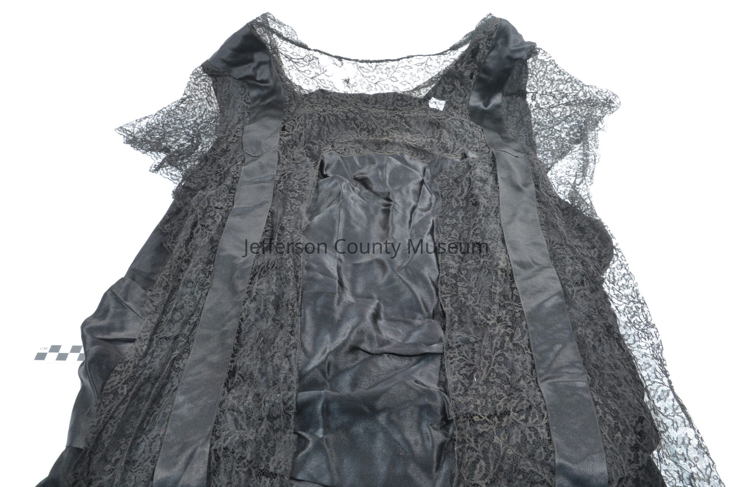 Black silk and lace calf length evening dress. A lace and satin streamer falls from each shoulder to the length of the dress. The hip length waist has a large piece of satin fastened on the left hip with a black plastic buckle.Acquisition