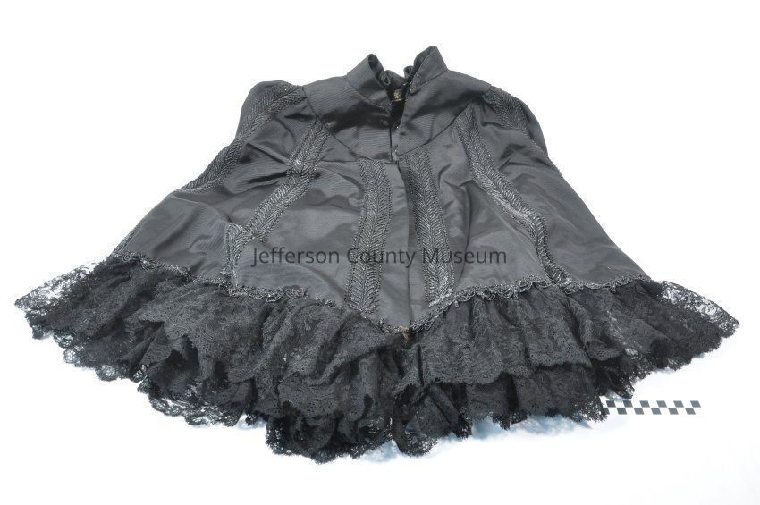 Black silk twill cape with lace ruffle trimmed with small jet beads. Lined with black silk. French. Label on inside of collar says "Mon Chretien". A label below and behind that says "DEPOSE PARIS'.Acquisition