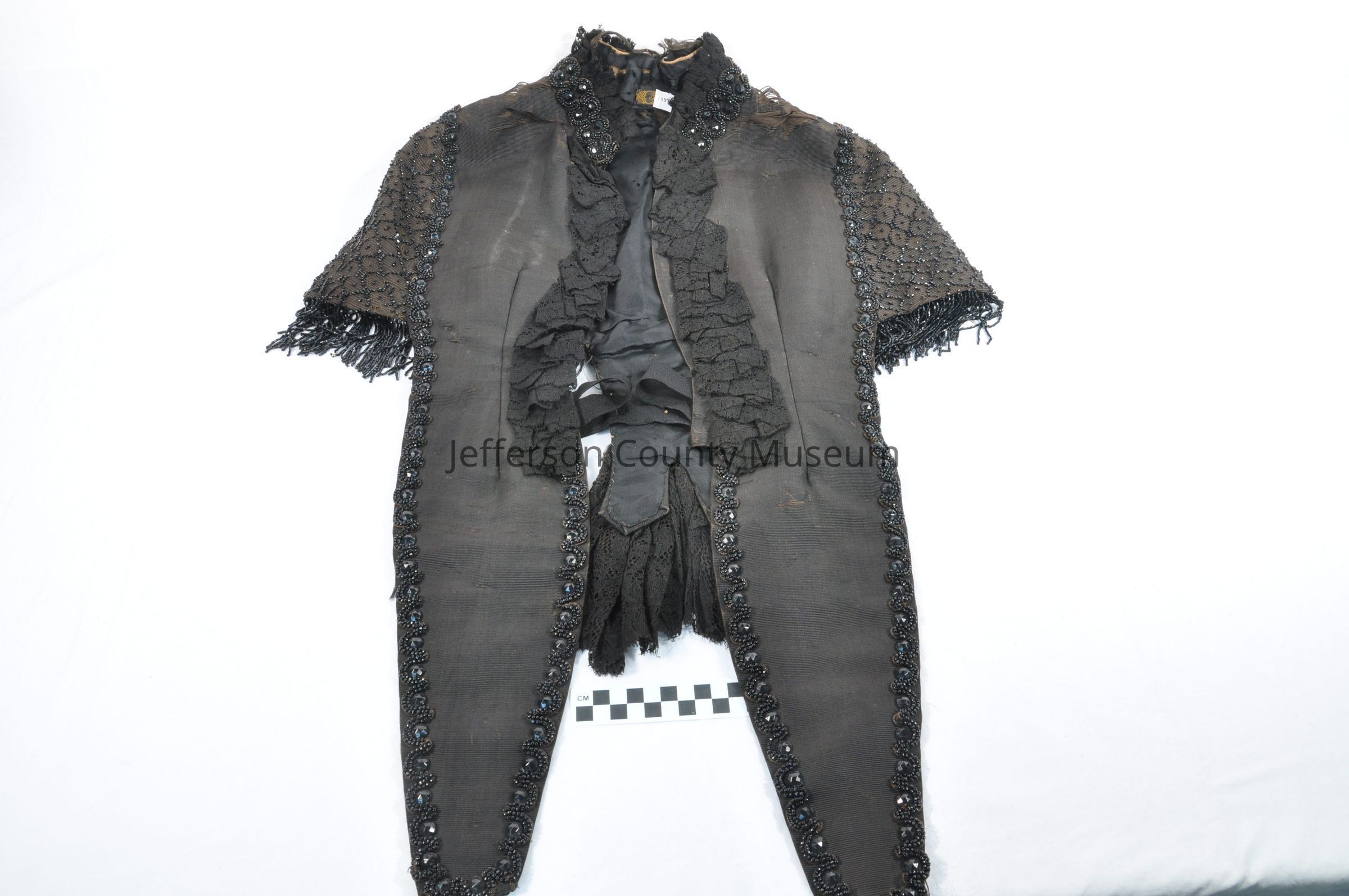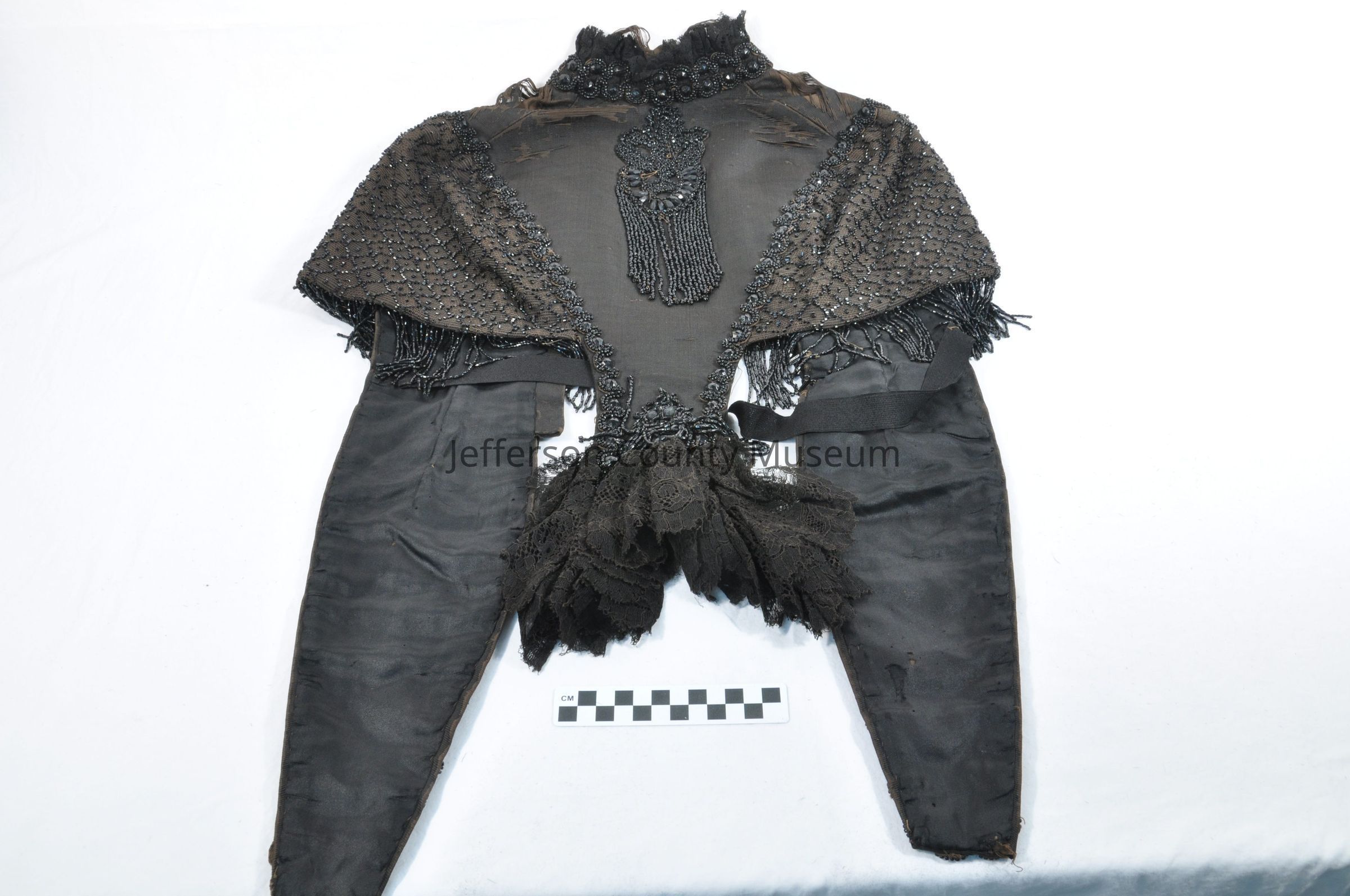 Black twill cape trimmed with lace and jet beadsEntry/Object ID