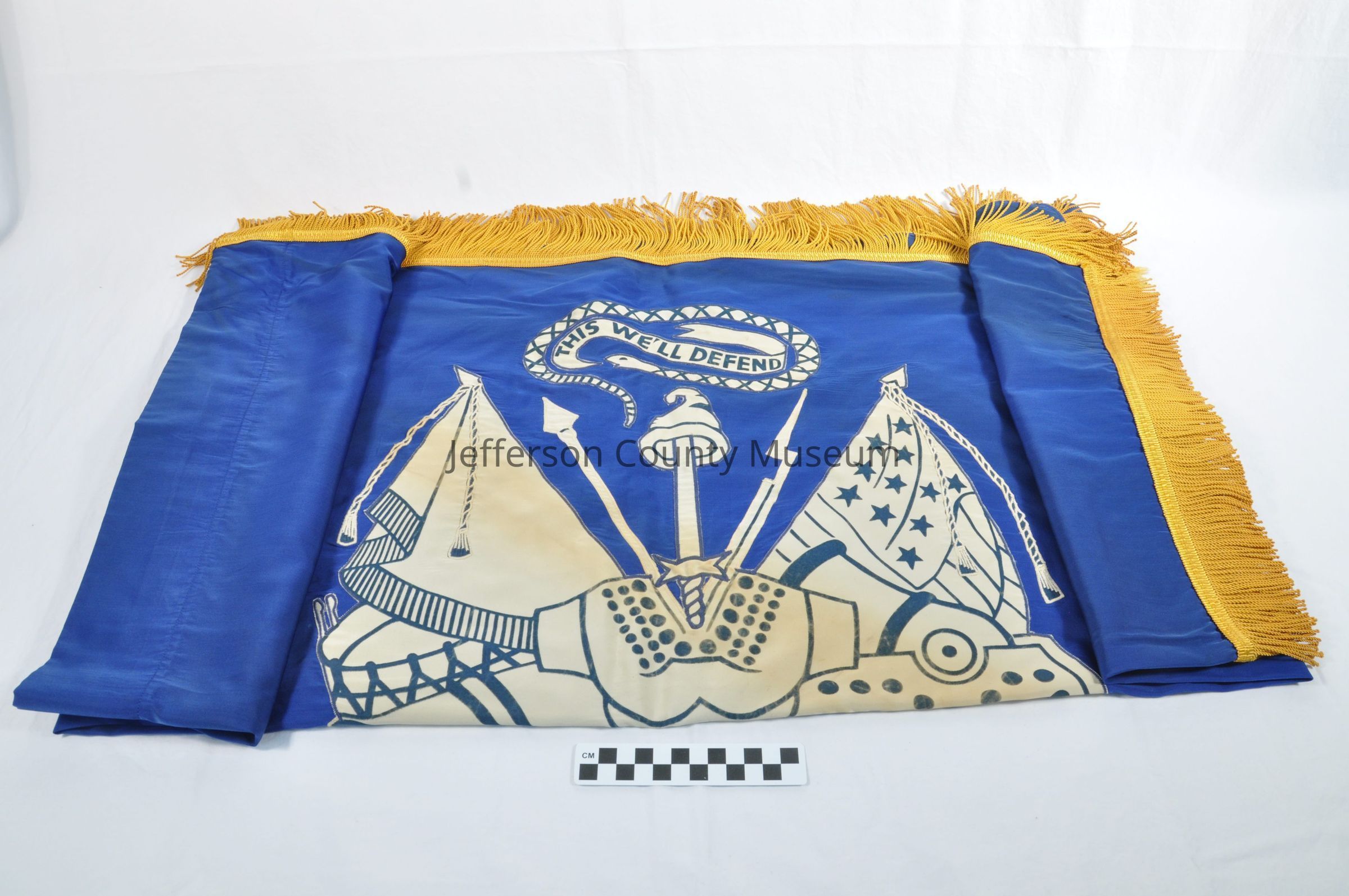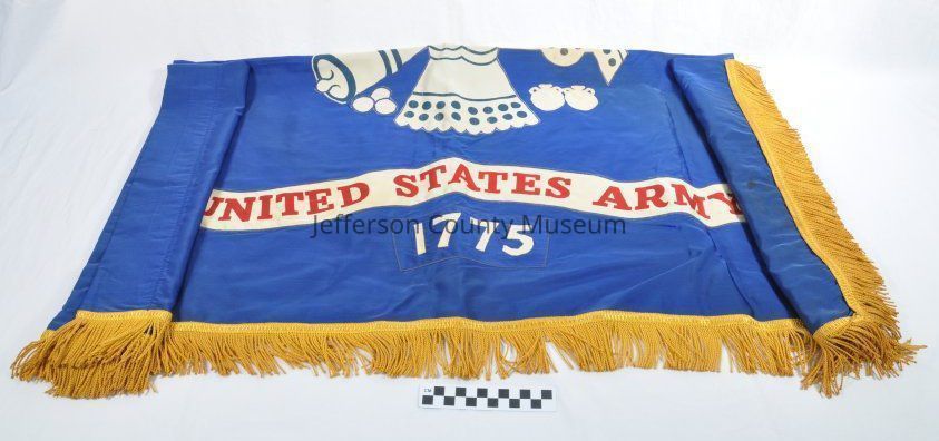 Blue satin flag with gold fringe. White U.S. Army insignia in center with flags, cannons and Roman suit of armor. Small banner at top with snake coiled around it is "THIS WE'LL DEFEND" In white banner at bottom in red letters "UNITED STATES ARMY". "1775" at bottom in white.Acquisition