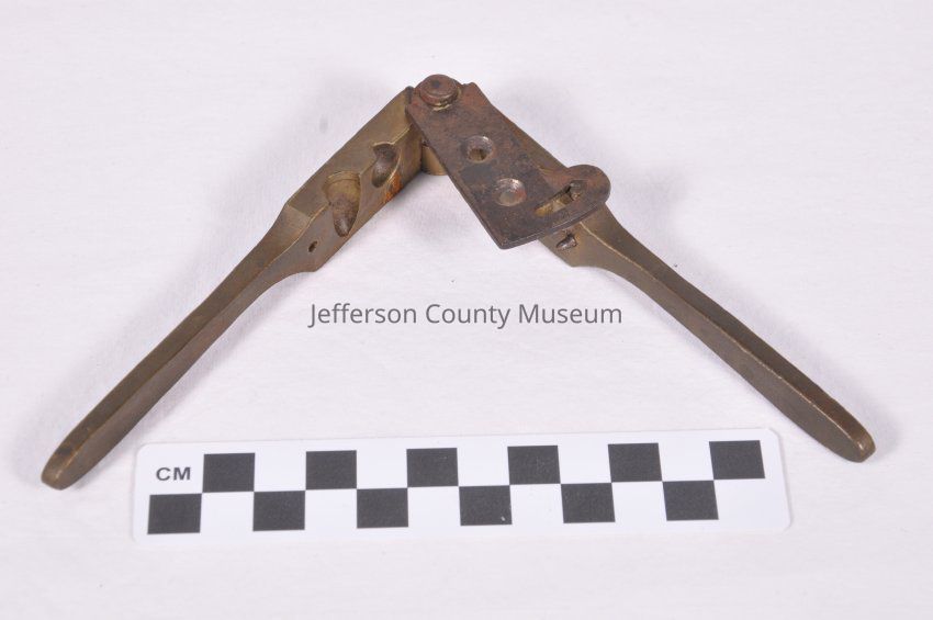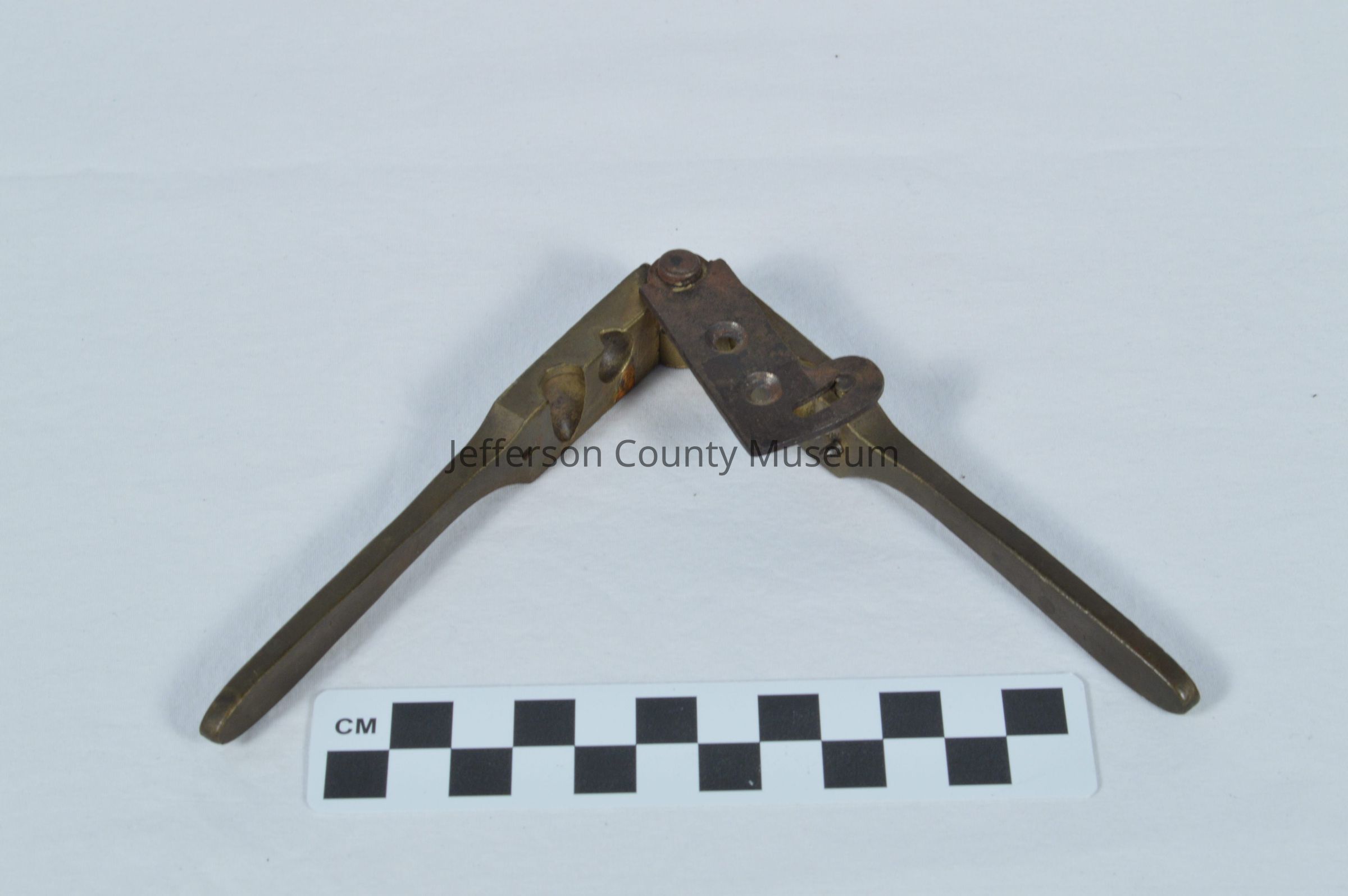 Brass bullet mold with two cavities (one conical and one round) for making .375 caliber bullets. Two hinged, brass arms press the sides of the mold together. Iron spruce cutter is hinged to one side of the mold cavities.Acquisition