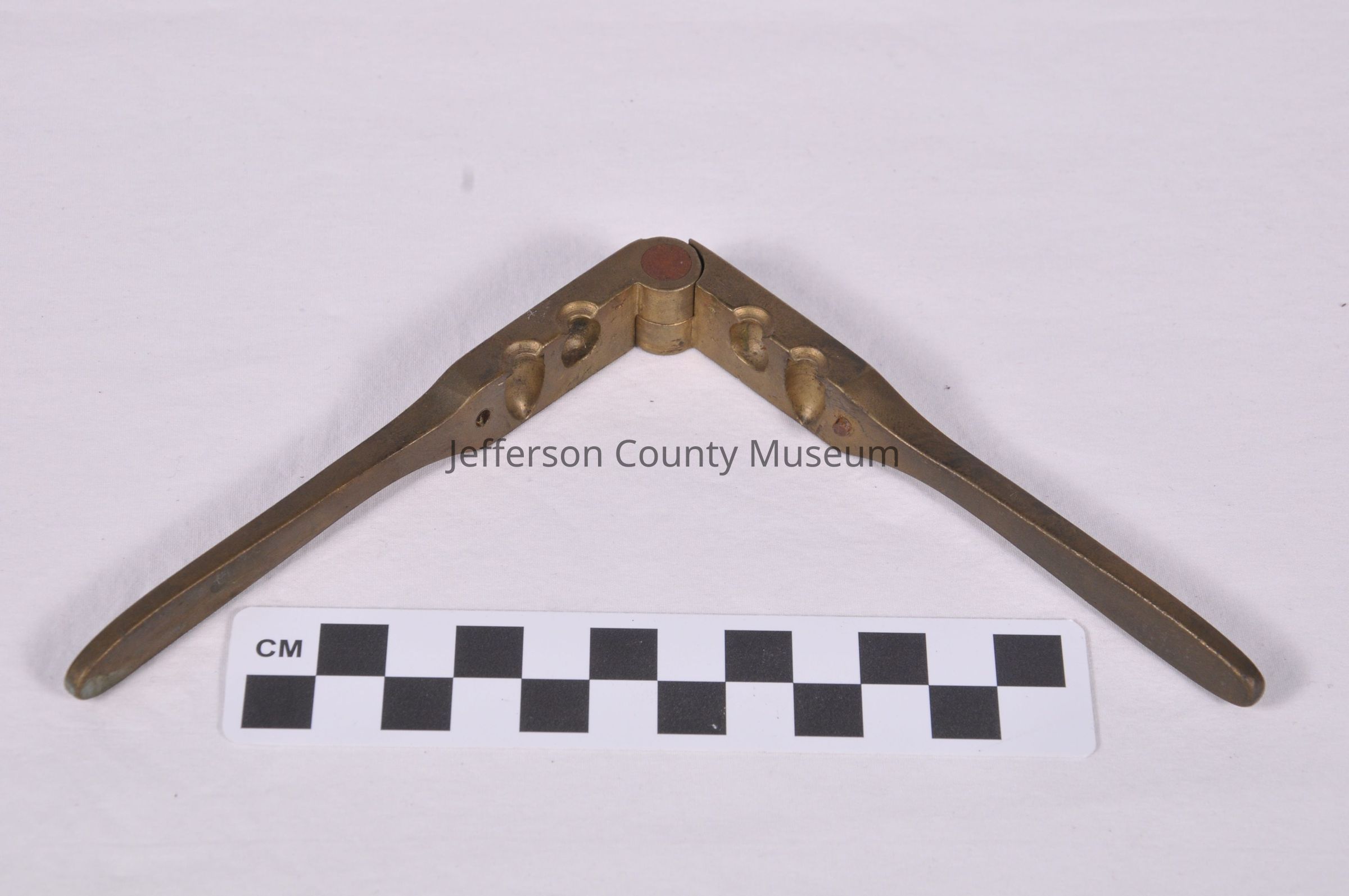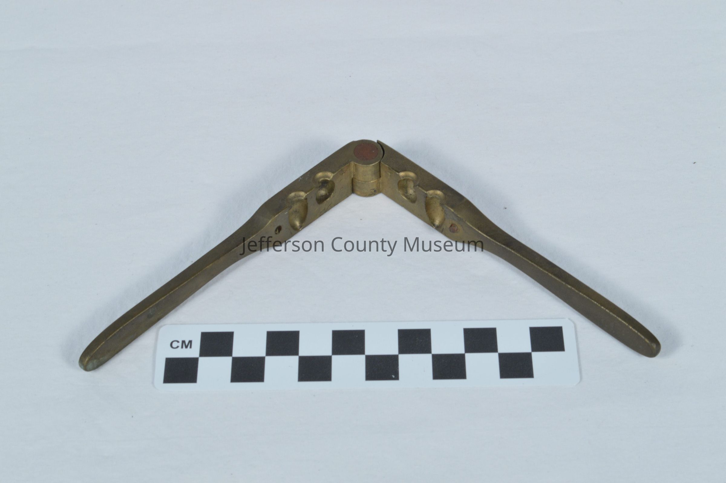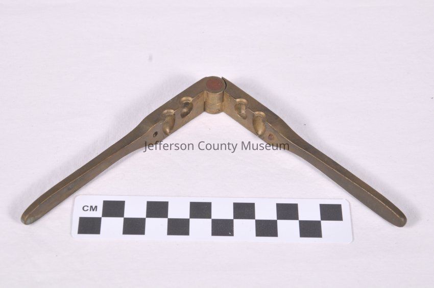 Brass bullet mold with two cavities (one conical and one round) for making .31 caliber bullets. Two hinged, brass arms press the sides of the mold together.Acquisition