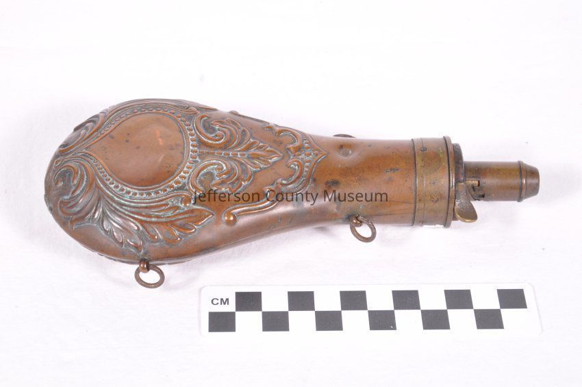 Brass pouring spout with measuring device marked 2 through 2 3/4 drams. Also marked "CRARY RENHAMX CO" (?). Flask is made of copper with design in relief. Three hanging rings.Acquisition
