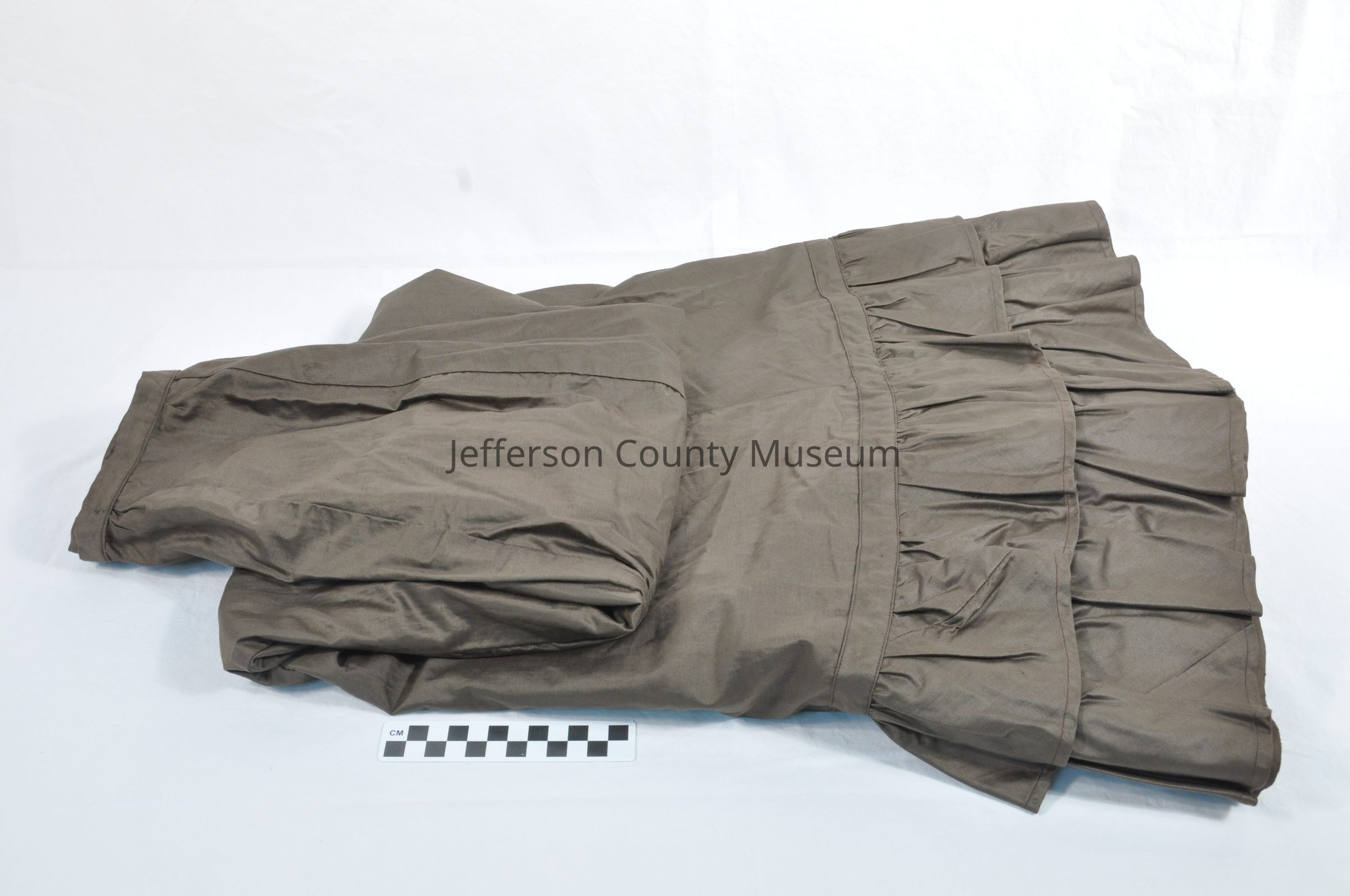 Brown chintz skirt with two tiers of ruffles on the bottom. Hook and eye closure at the waist.