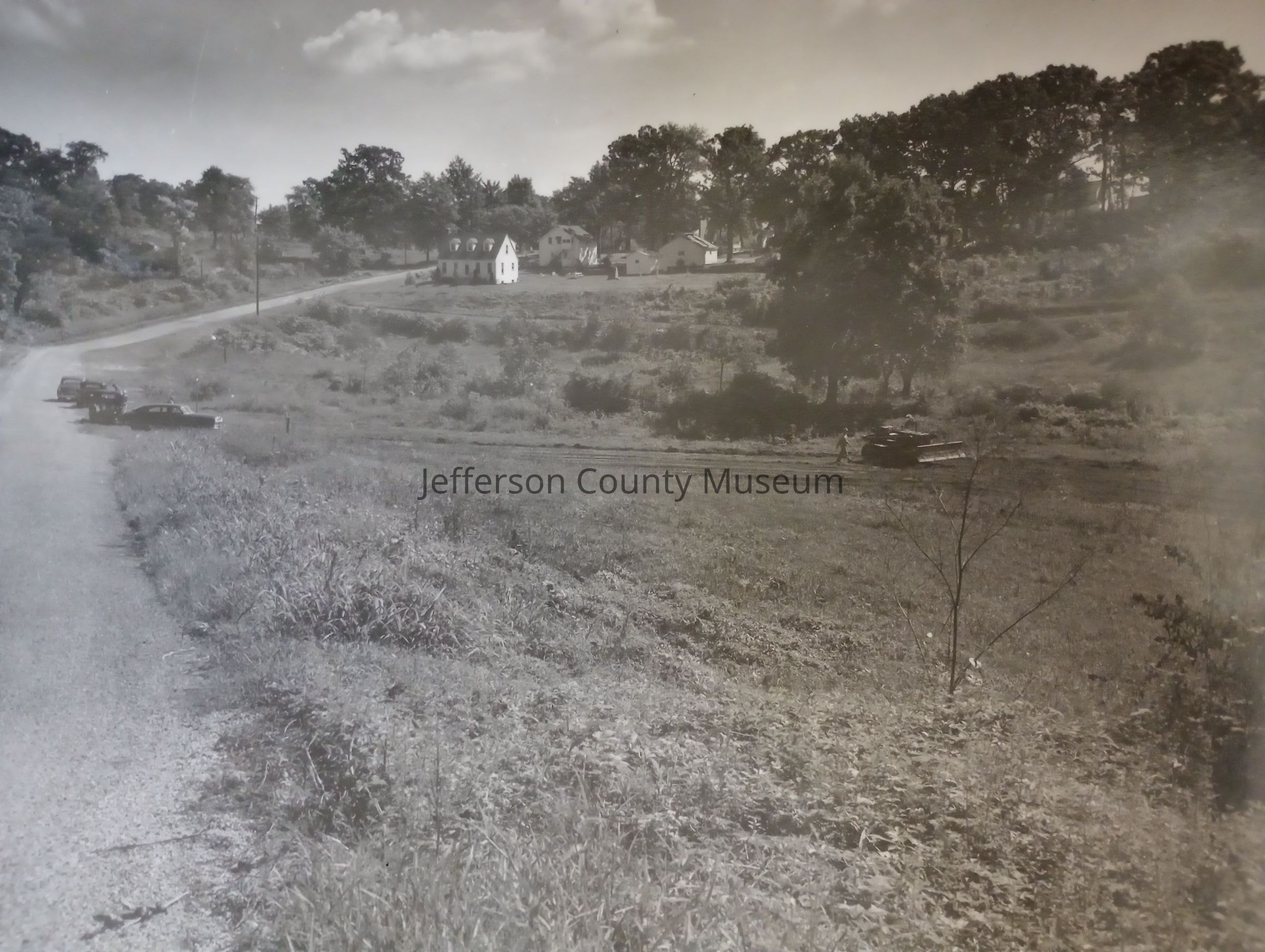 Black and white photo of a field to the right of a road with houses and trees in the background. A number of cars and men are stationed near the road, while one man walks toward a machine being used to level the ground. At the bottom is handwritten "Future site Jeff. Mem. Park 1948"Acquisition