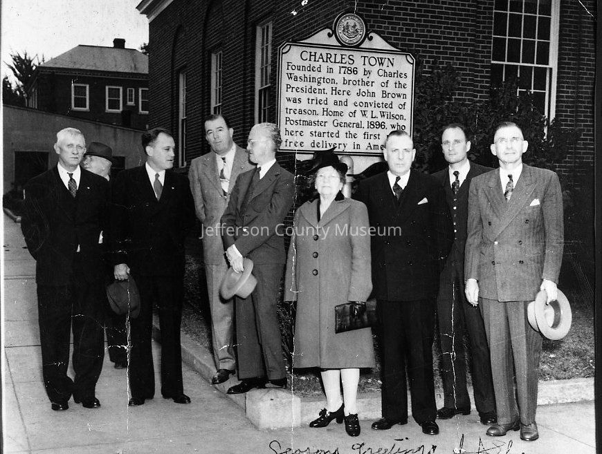 Nine persons in front of the Post Office and Charles Town 1946 marker; J.J. Eby, R.L.C., T.T. Perry, Postmaster, Jennings Randolph, M.C., Melvin T. Strider, Miss Estelle Gibson, J.M. Donaldson, 1st Asst. P.M. General, William E. Wilson, B.A. Winguest, Pres. National Letter Carriers Association. Autographed, "Seasons Greetings, J.J. Eby". Fitzpatrick Studios, Oct. 1, 1946.Acquisition