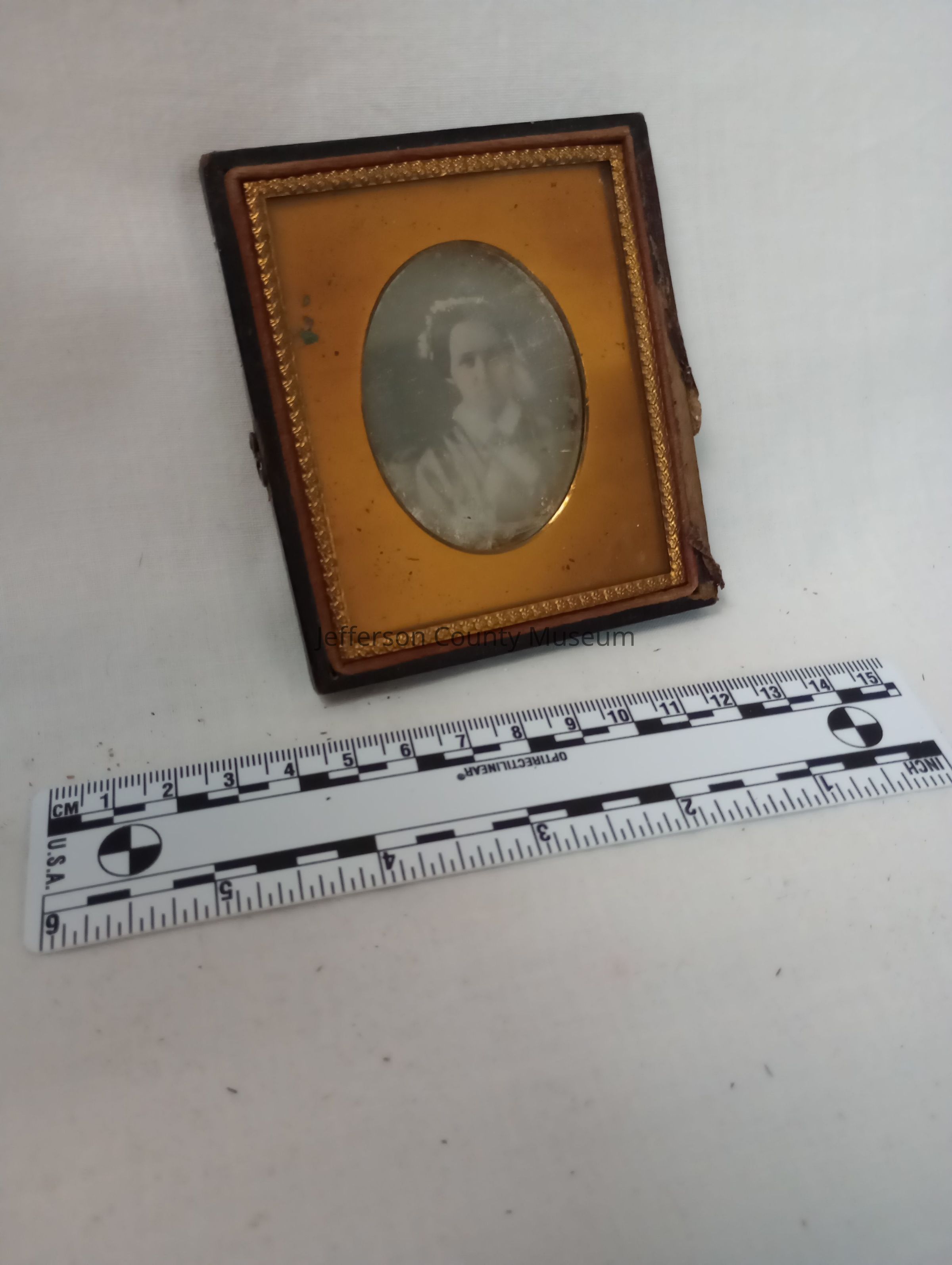 Daguerreotype of unidentified woman wearing a satin dress with a small pinned kerchief around the neck and a cap on her heard. Cheeks and lips have been tinted pink. Half of leather case is missing. Image was found by the donor at the Melvin Home at Duffields.Photograph Details