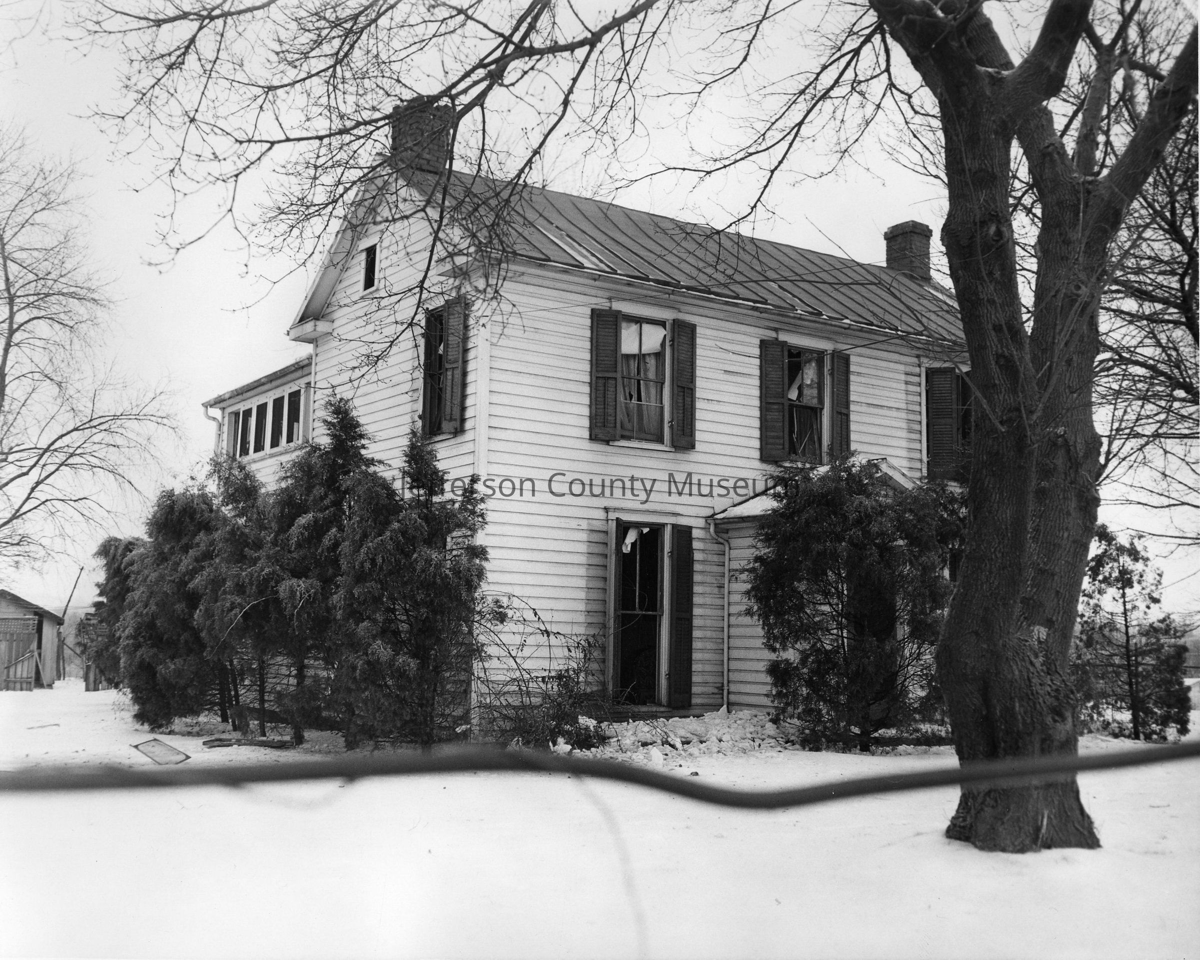 Halltown dynamite truck explosion - house with dark shutters showing broken windowsEntry/Object ID