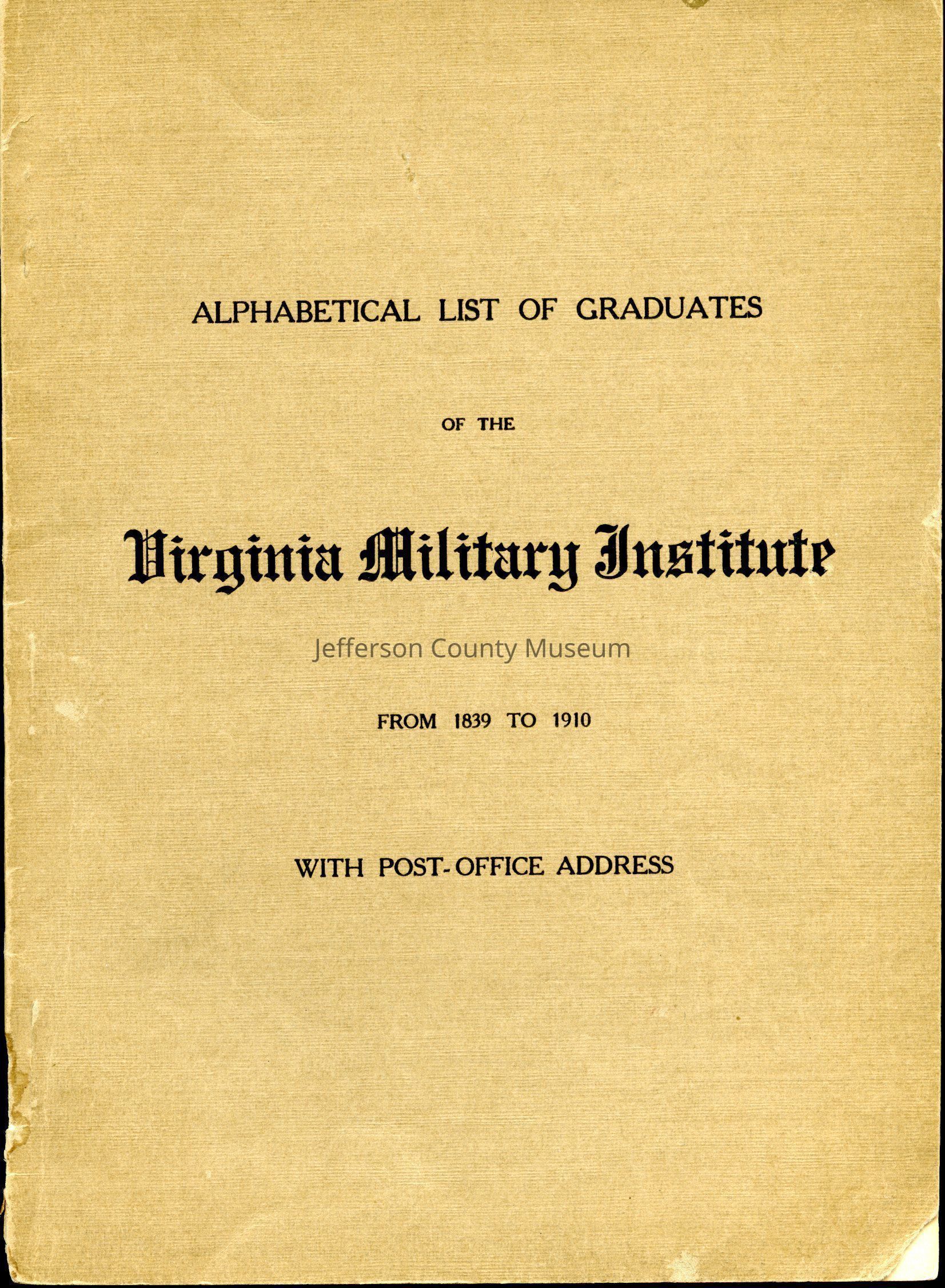 This pamphlet contains an alphabetical list of graduates from Virginia Military Institute for the period from 1839 to 1910. The list also contains all of the graduates post office addresses.Acquisition