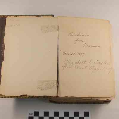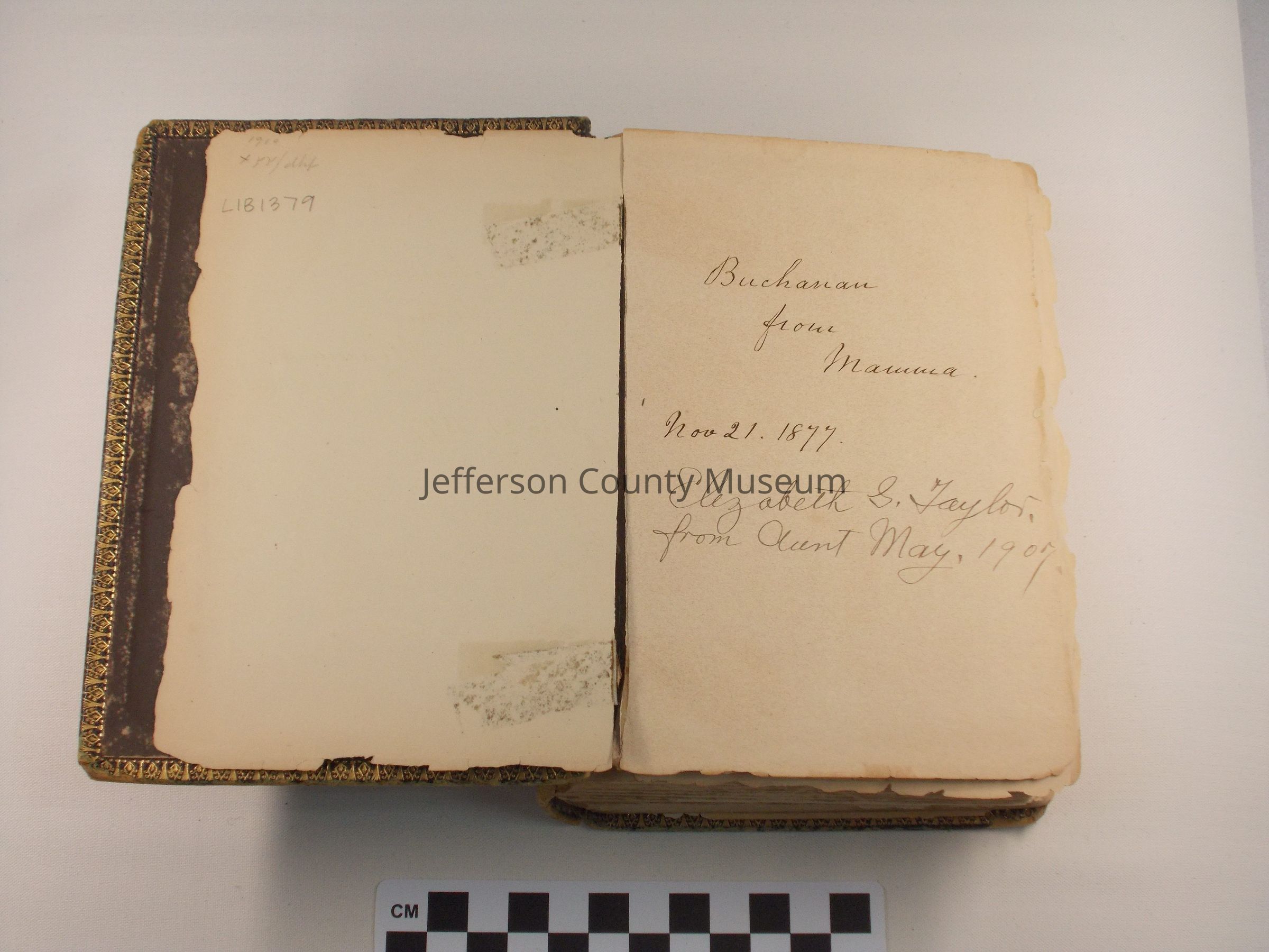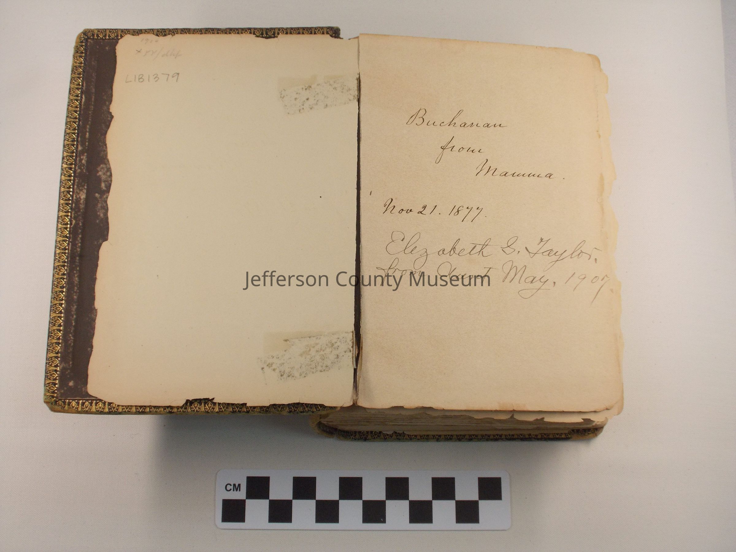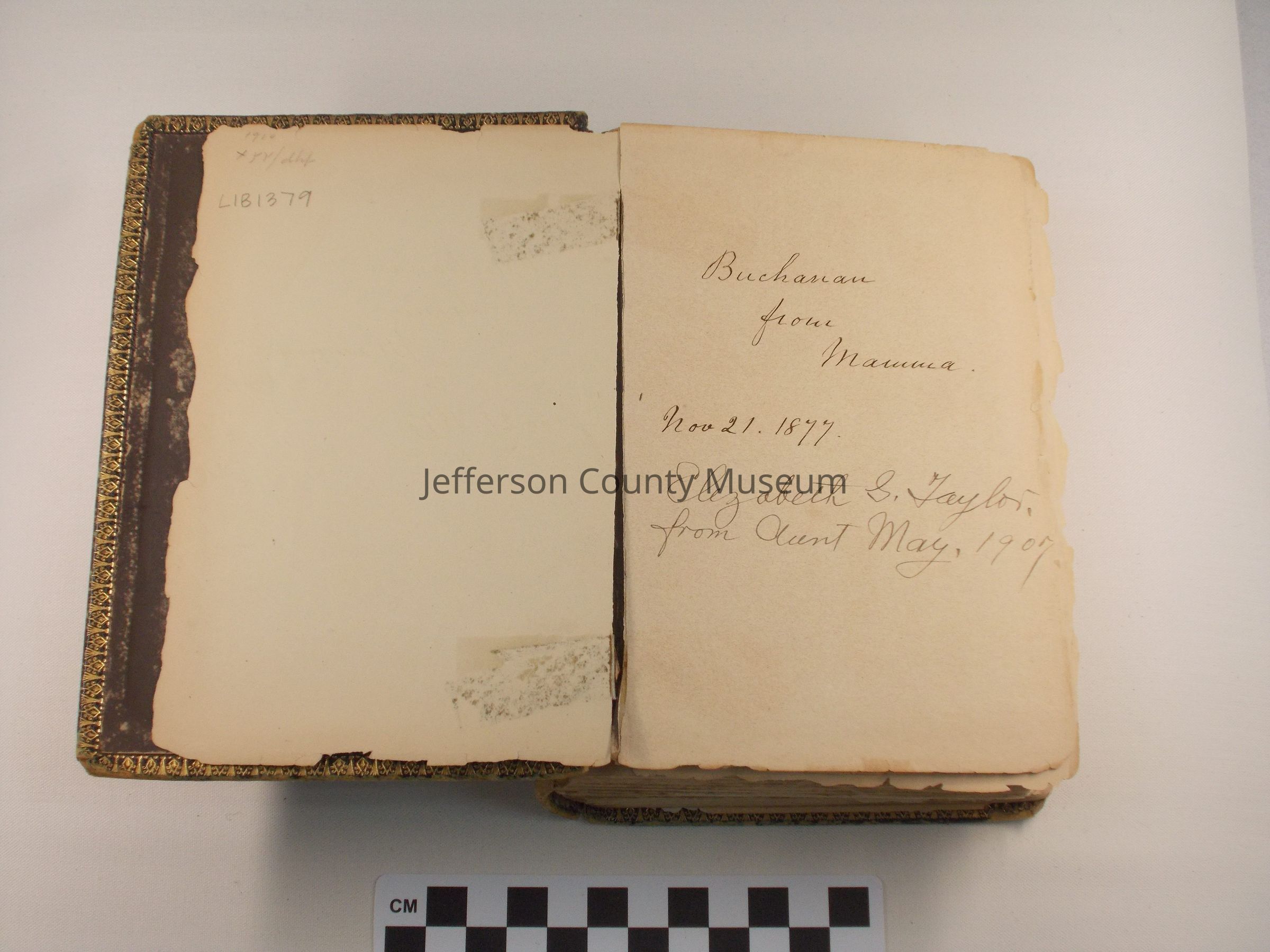 Front page has handwritten inscriptions: "Buchanan from Mamma. Nov 21, 1877" and "Elizabeth G. Taylor, from Aunt May, 1907"
