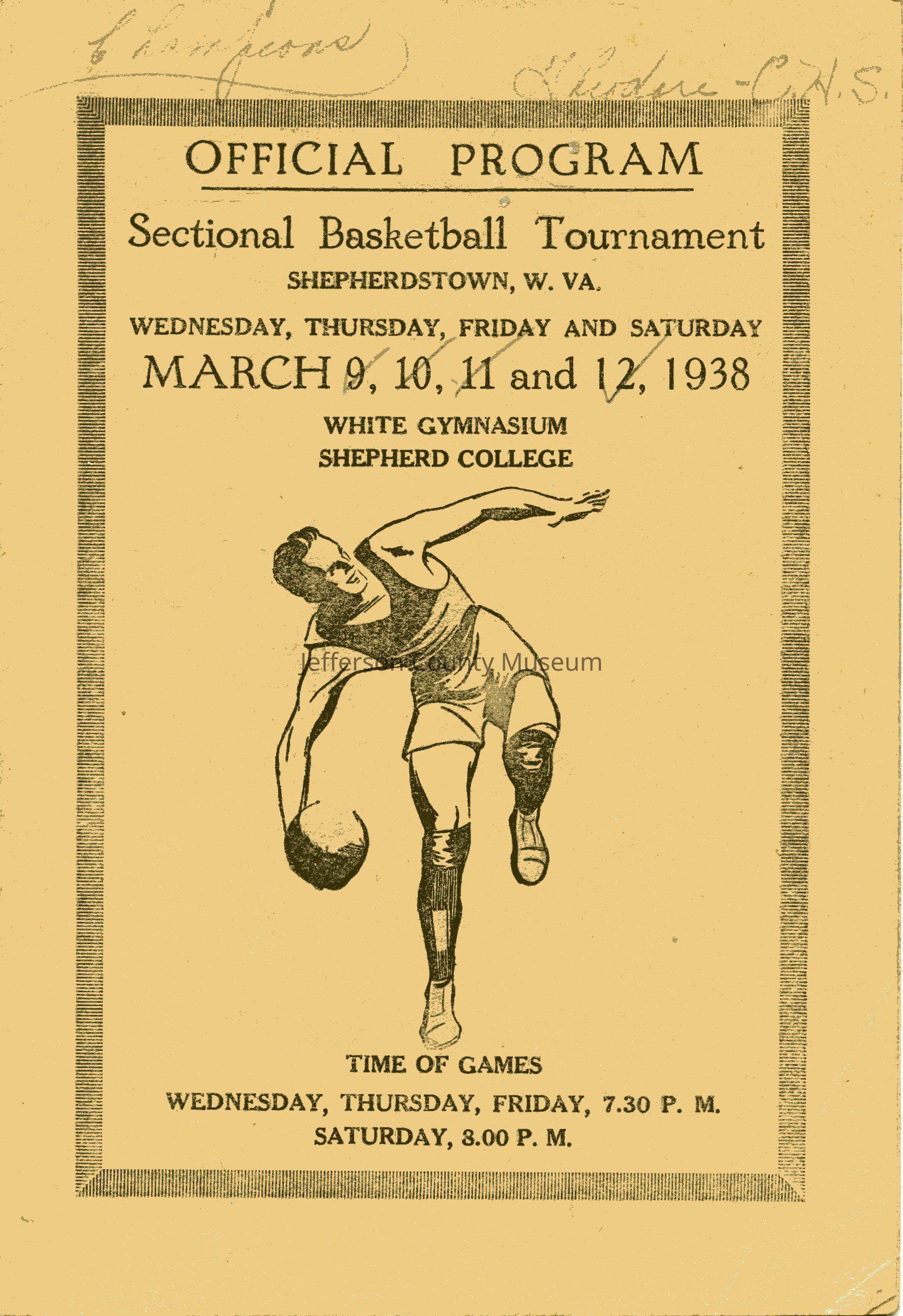 OFFICIAL PROGRAM Sectional Basketball Tournament SHEPHERDSTOWN, W.VA. WEDNESDAY, THURSDAY, FRIDAY AND SATURDAY MARCH 9, 10, 11, and 12, 1938Entry/Object ID