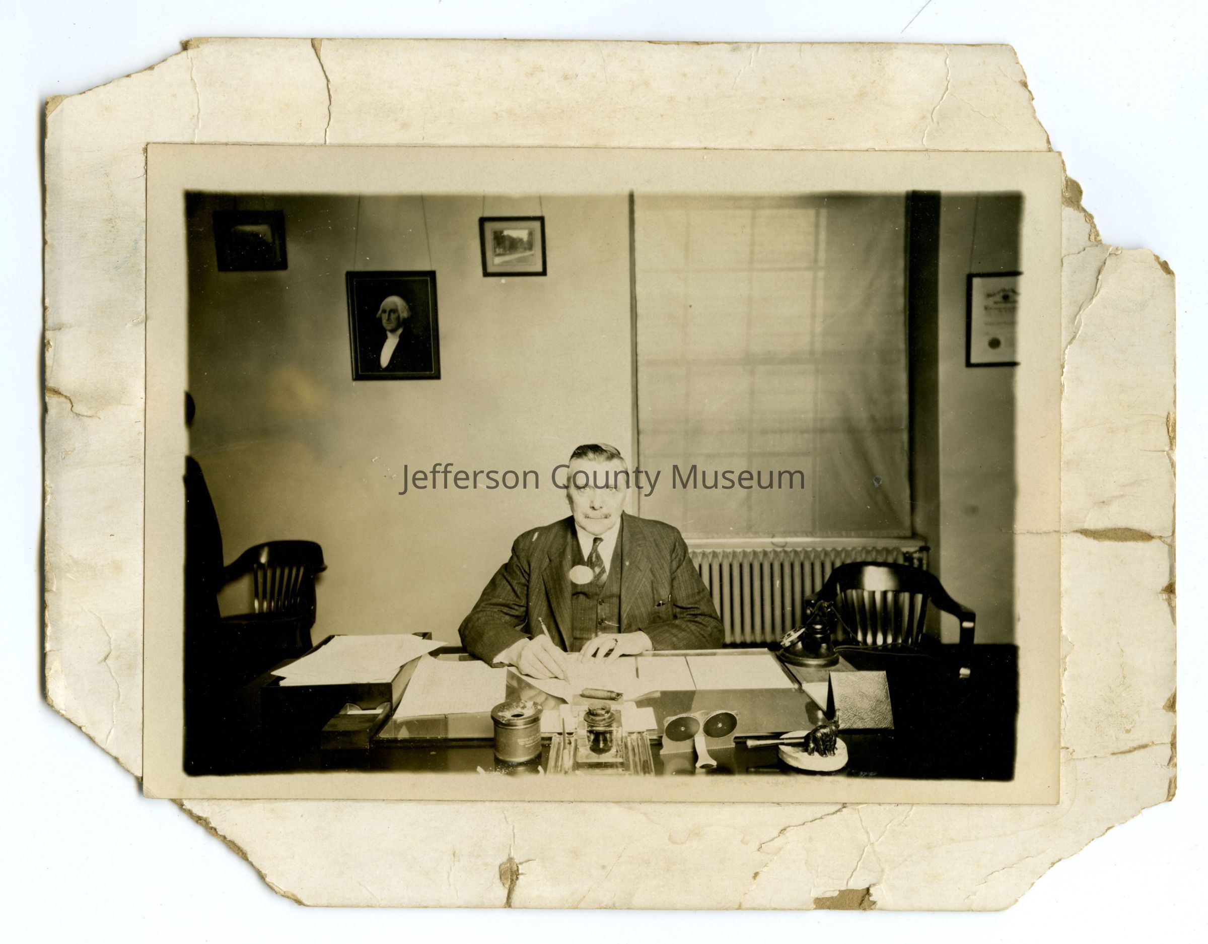 Mounted black and white photo of a man seated at a desk signing a document with a fountain pen at the National Bank in Charles Town, near where Needful Things is today. Behind him is a portrait of George Washington and several other certificates and photos. Historian Doug Perks says that the man behind the desk is part of the Morgan family of Ripon Lodge.Acquisition