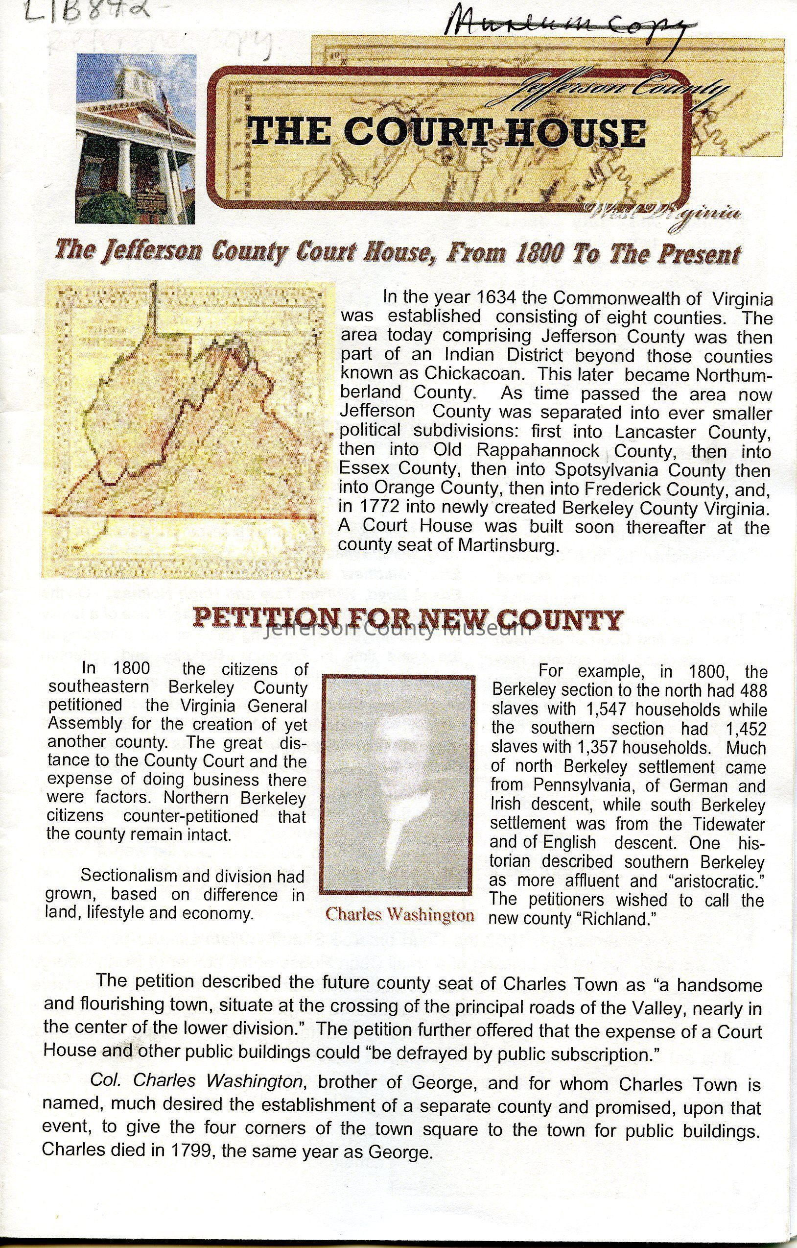 Historic information about the Jefferson County Court House, located in Charles Town, West Virginia, in addition to current contact and visiting information.