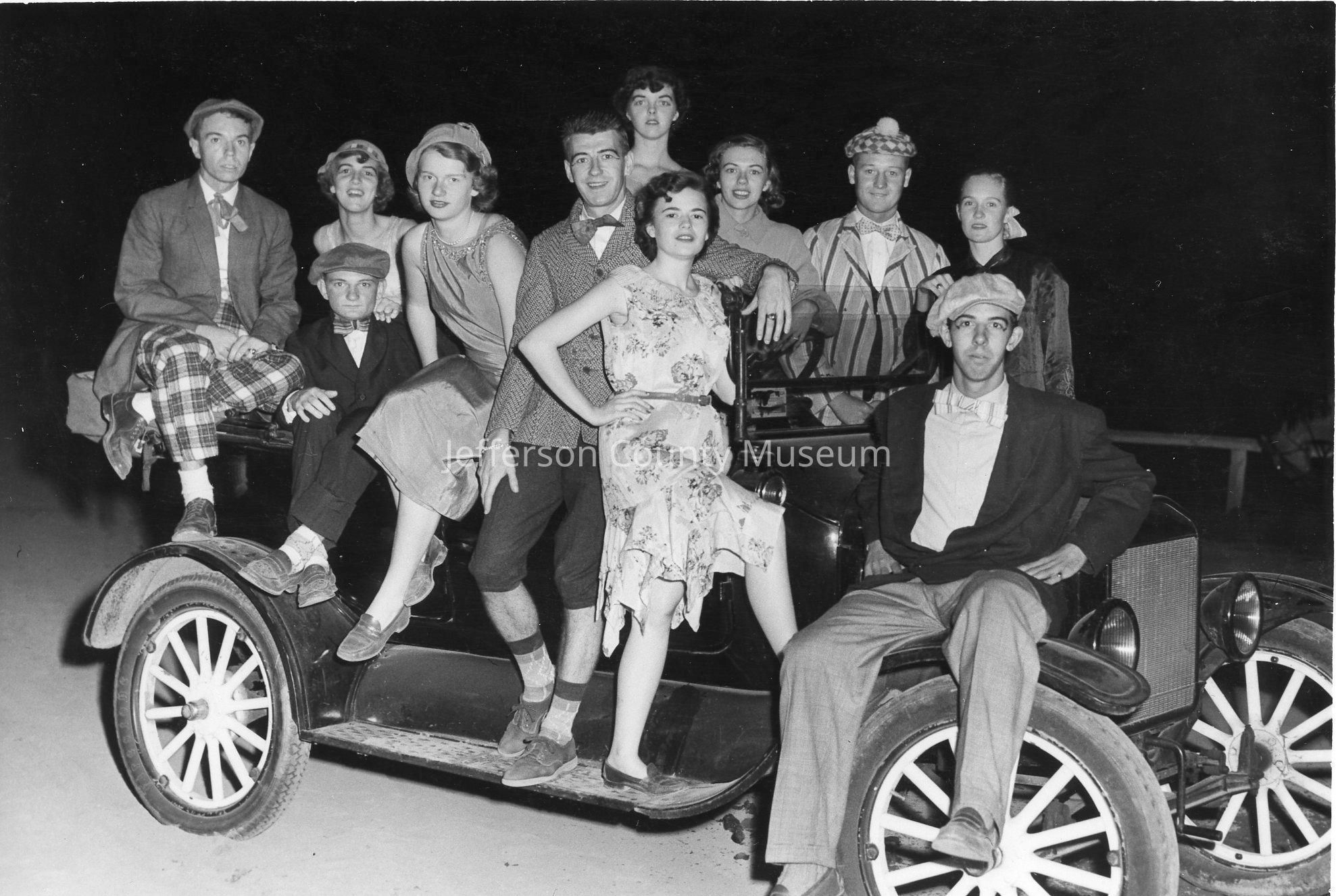 Jefferson County Sesquicentennial celebrations - old car with 11 young men and women posing on the car in costume.