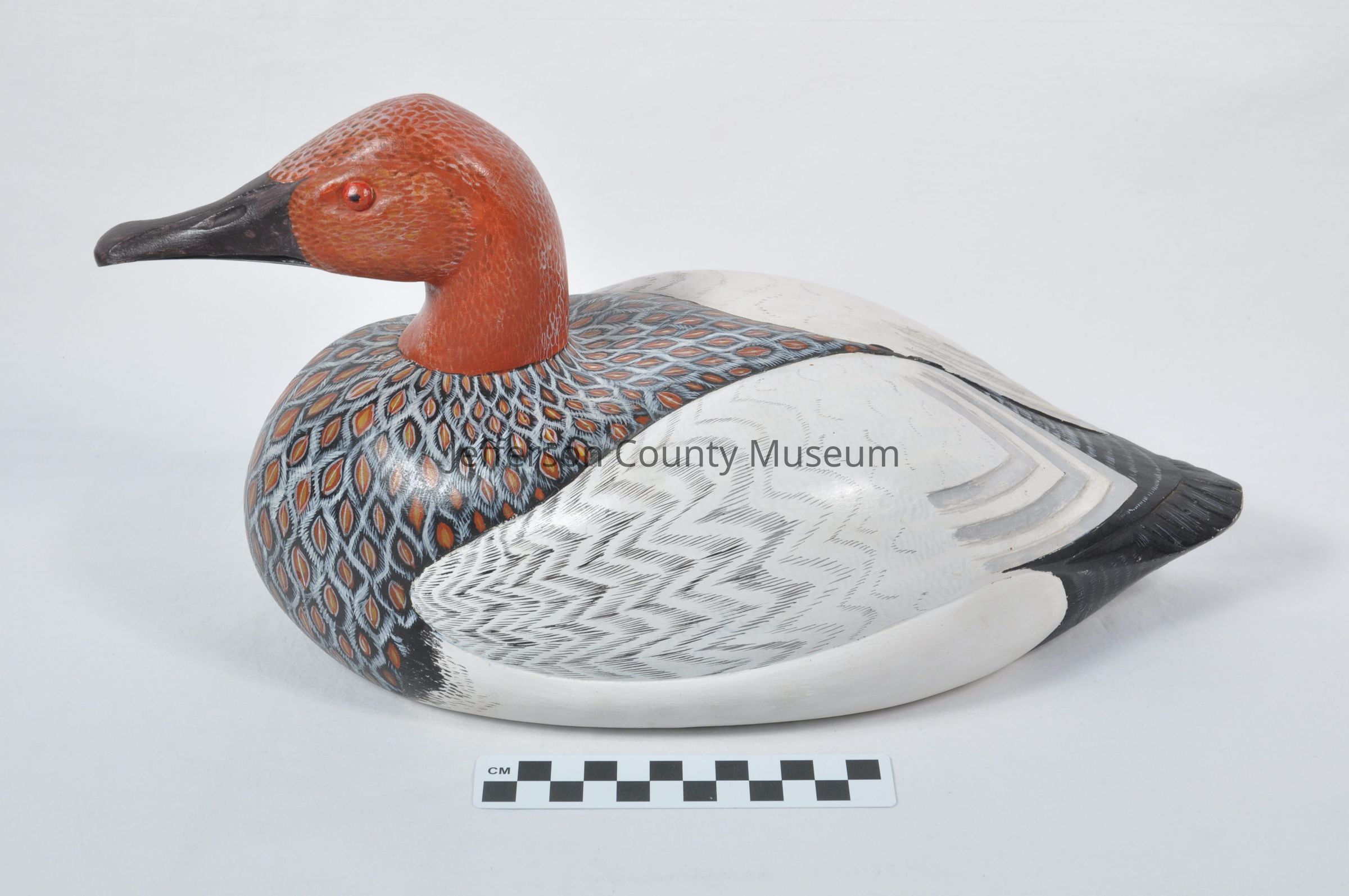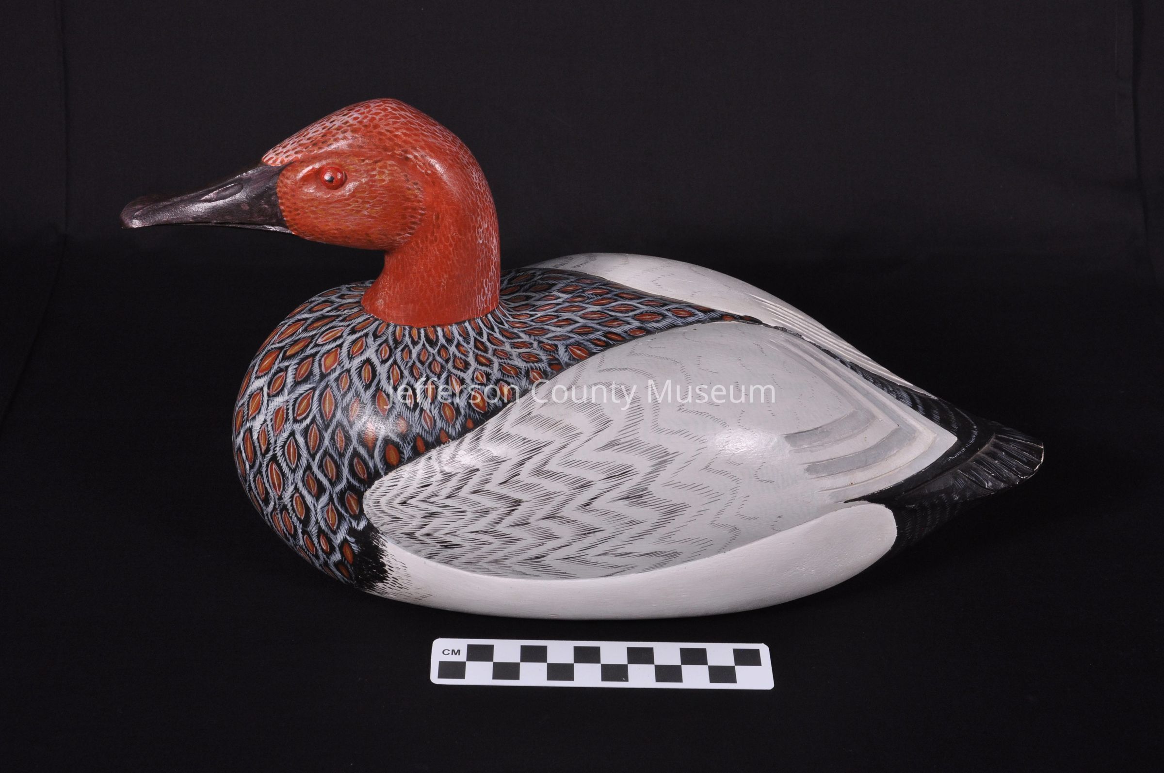 Life size painted wood carving of canvasback duck, carved as if floating on water with wings folded over back. Carving has black bill, red head, white wing and body and red, black and white feathers on breast.Acquisition
