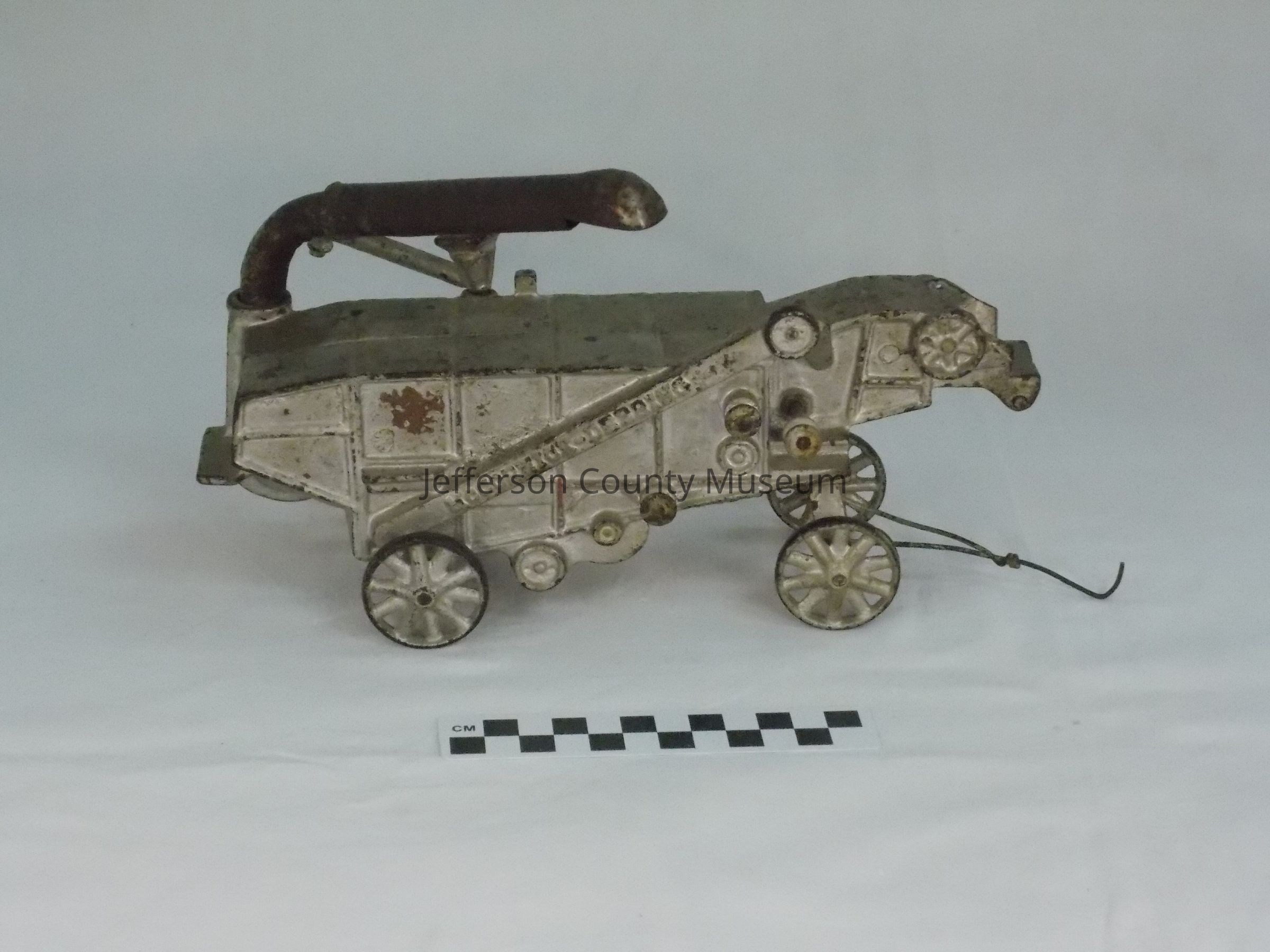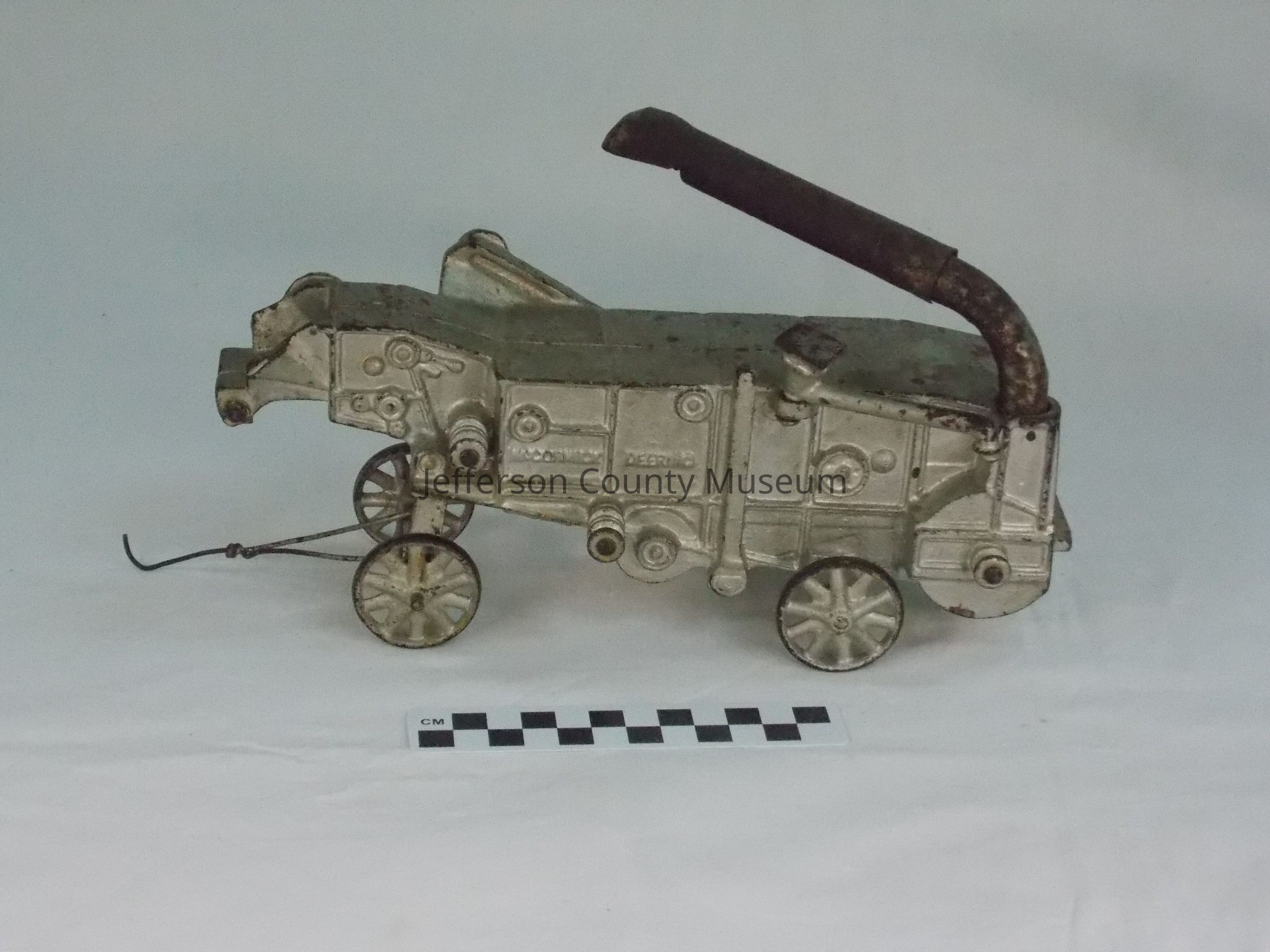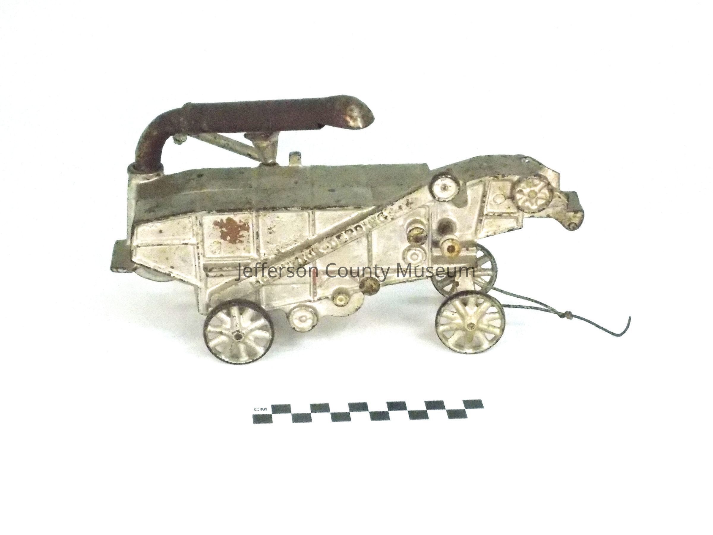 Cast iron threshing machine painted silver. Machine is on four wheels and has a tongue for pulling with a tractor or horses. There is a chute in the front for putting in the wheat and a boom pipe on back for disposing of the chaff. Embossed on an arm on the right side is "McCORMICK-DEERING". This is also embossed on left side. Embossed inside on left side is "MADE BY ARCADE MFG. Co.". Embossed inside on right side is "FREEPORT, ILL."Acquisition
