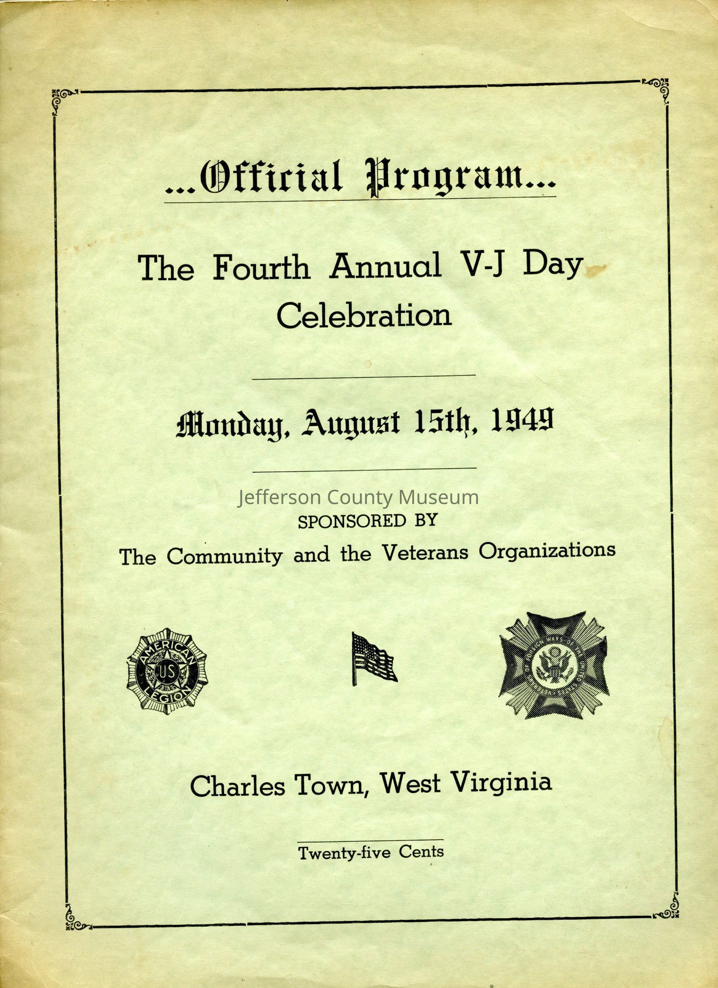 The program for the fourth annual V-J Day celebration in Jefferson County. Includes a list of all of the contributers to the program, a program of events, and ads for several local businesses.Acquisition