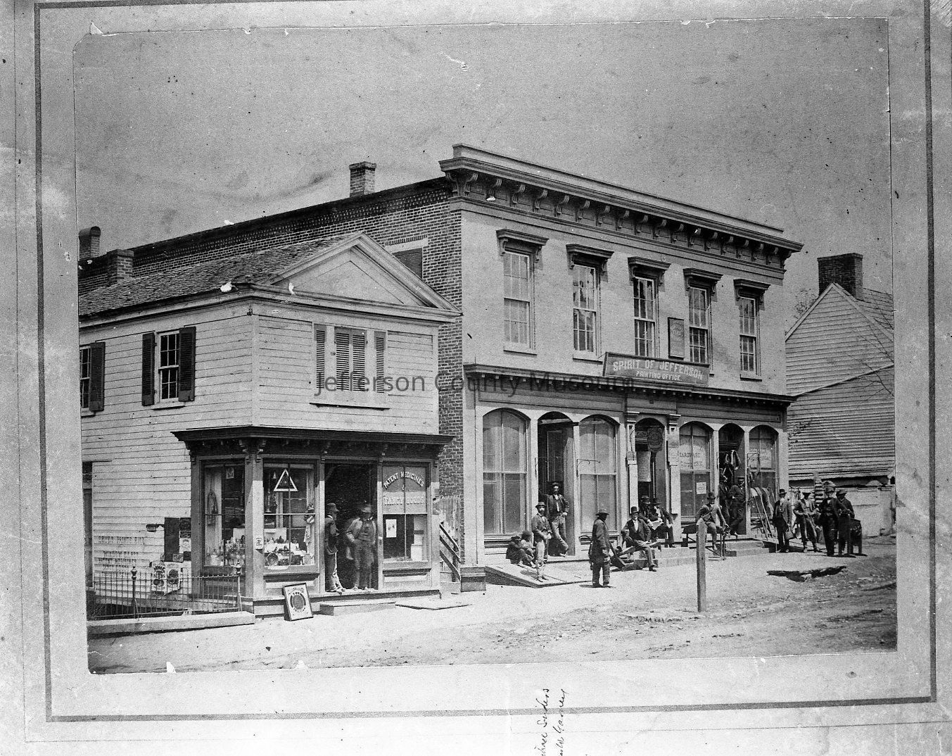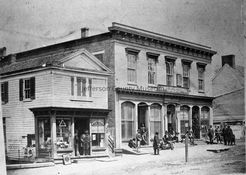 Spirit of Jefferson printing office, 110 East Washington Street, on the north side of East Washington Street between George and Samuel streets, and Aisquith & Company Pharmacists at 108 East Washington Street