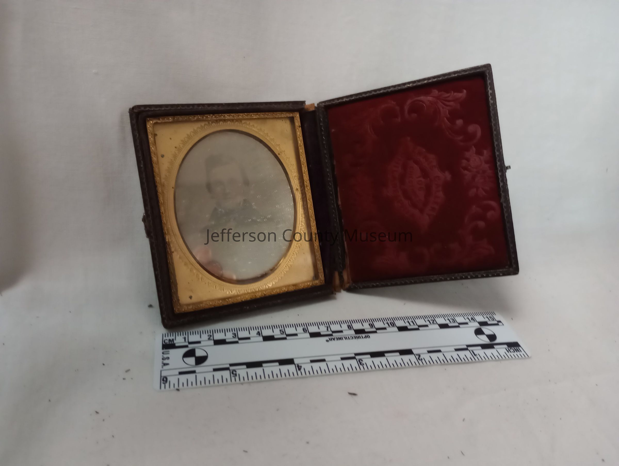 Daguerreotype of an unidentified man posing in a jacket with a large collar and buttons. Cheeks have been tinted pink. Photo is framed in a leather case with a bird on the front, and was placed in the case upside-down. Image was found by donor at the Melvin Home at Duffields.Acquisition