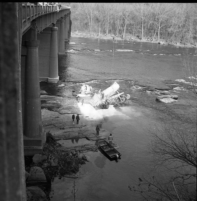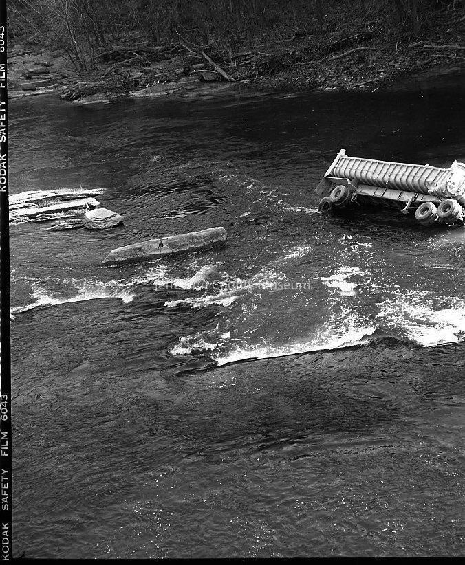Teddy Shillingburg drove the truck through the concrete guard rail after swerving to avoid hitting an oncoming car that had skidded on ice on the bridge. The truck fell over 75 feet to the riverbed below. The driver survived the fall.