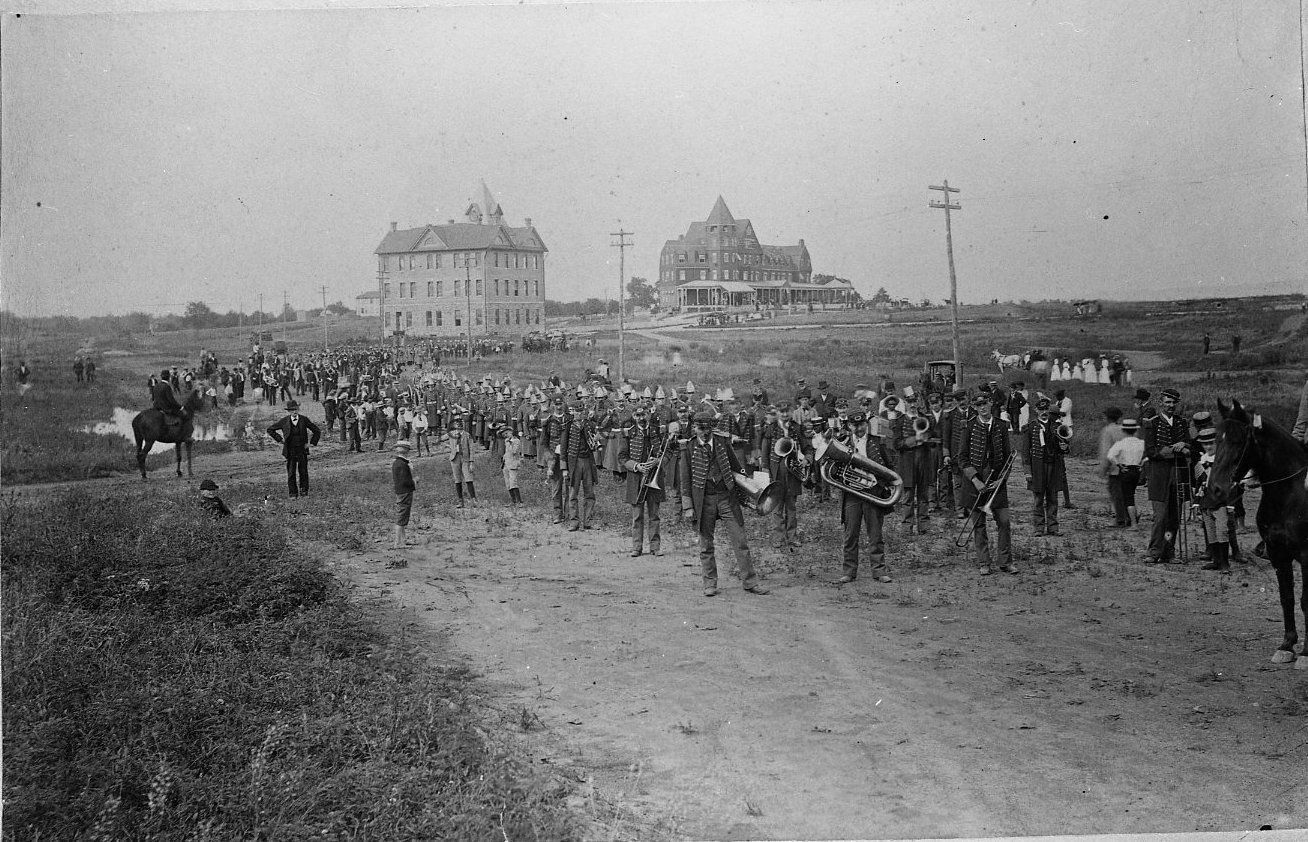 View looking north into Ranson c. 1899. Taken from an approximate position on Samuel Street near Fairfax Boulevard and First Avenue. Buildings are (left) headquarters for the Charles Town Mining, Manufacturing, and Improvement Co. which would become first Charles Town Graded and High School and then town hall for the City of Ranson. On the right is the Hotel Powhatan (also known as Wormley's Inn), which became the Powhatan College for Young Women in 1900 and then St. Hilda's Hall in 1915.
