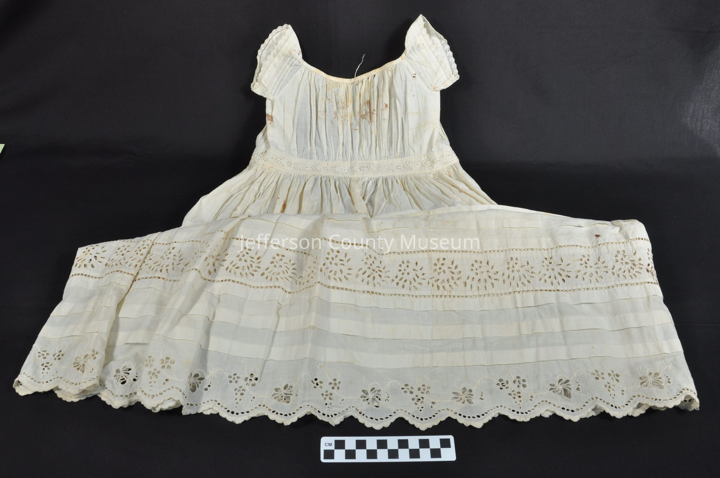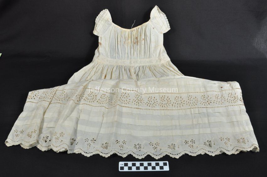 Child's cotton dress which was once probably white but is now yellowed. Short sleeves, fancy work at waist and bottom. Two buttons and strings in back. Note (typed and handwritten) attached with straight pin. Typed note: "A hand made Baby dress. Loaned by Miss M. B. Grantham." In ink handwriting "To a museum in Summit Pt." Pencilled handwriting: "Made by Mary Eliza Bowen Grantham in 1863" Note on back handwritten in pencil: "Displayed at Historical Society in Middleway May 21, 1938".Acquisition