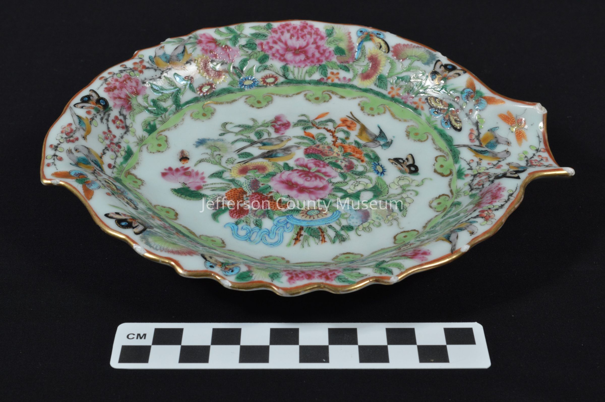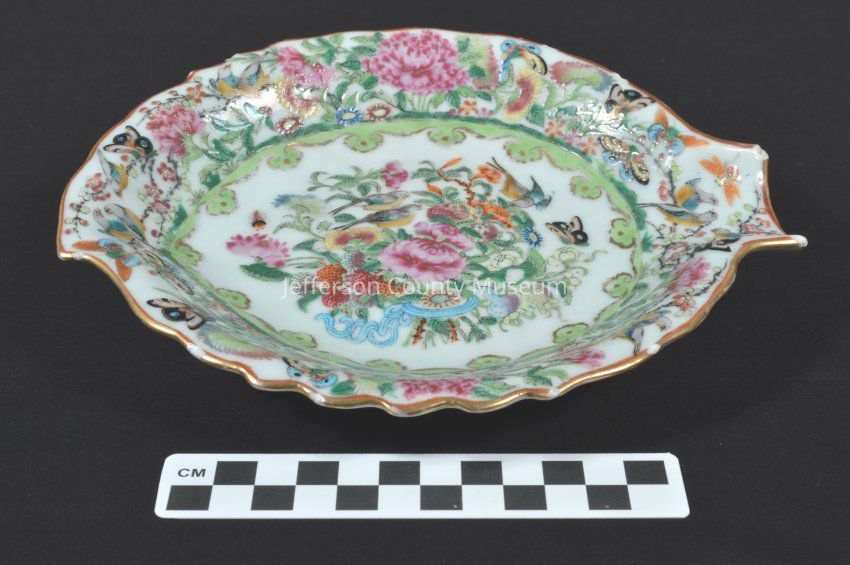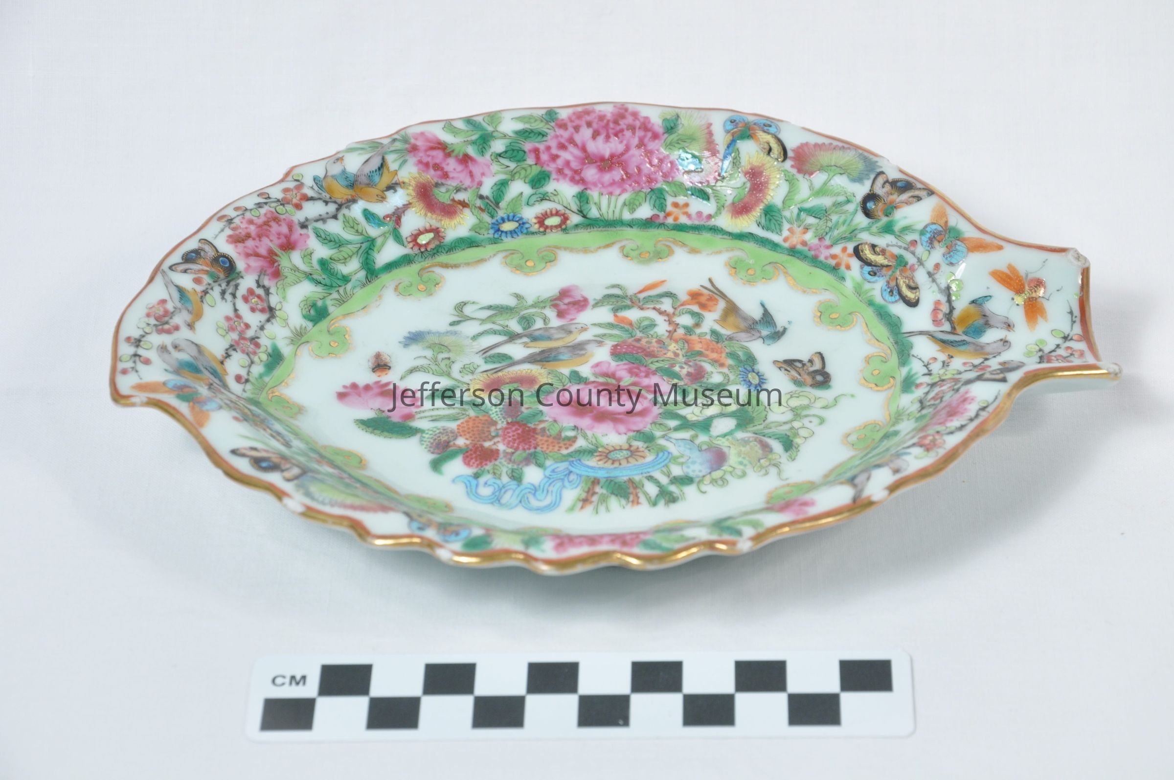 Chinese export celery dish. Floral design with birds, butterflies and insects. Unusual leaf shape with open stem on one side.Acquisition