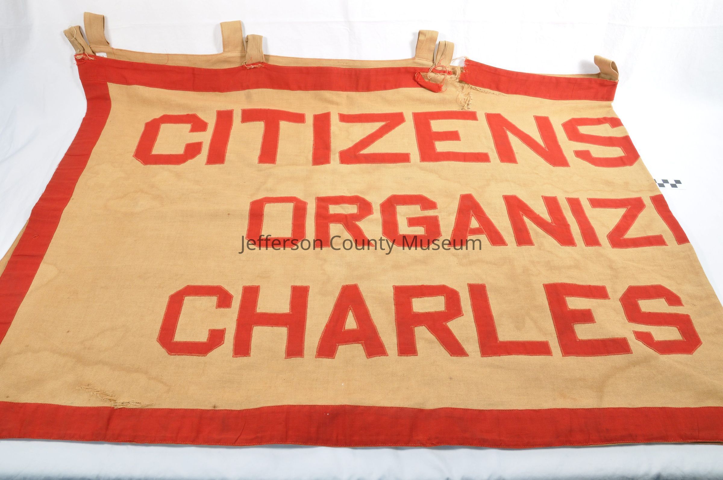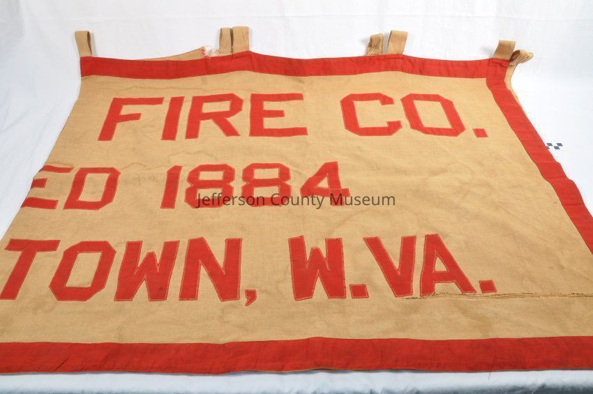 Red and tan cotton flag. Loops at top for hanging. In red on flag "CITIZENS FIRE CO. ORGANIZED 1884 CHARLES TOWN, W.VA.".Acquisition