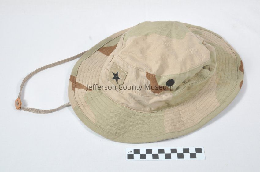 50% nylon, 50% cotton desert camouflage "boonie" hat. Wide brim all around, cloth strap with leather keeper for securing under chin. Two black round ventilation holes with screens are on each side. Single black star sewn on front. Label sewn inside in part says "HAT, CAMOUFLAGE PATTERN, DESERT". Has laundering instructions. Written in black felt tip pen is "Lloyd". A smaller label has "SIZE 7 5/8".Acquisition