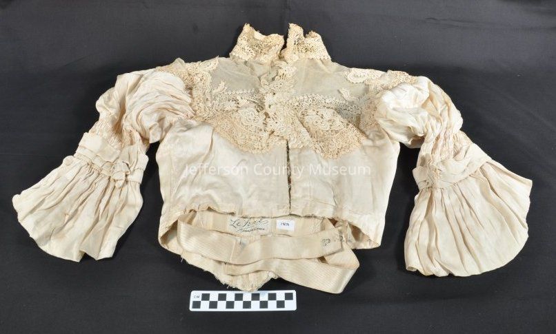 Cream colored satin blouse with applied embroidery on front and back. Hook and eye closures. Long sleeves are puffed at the shoulders but not leg-o-mutton. Cloth belt on inside with hook and eye closures. Stays around waist which is higher in front than back. Label on belt says "Le Fevre Philadelphia".Acquisition