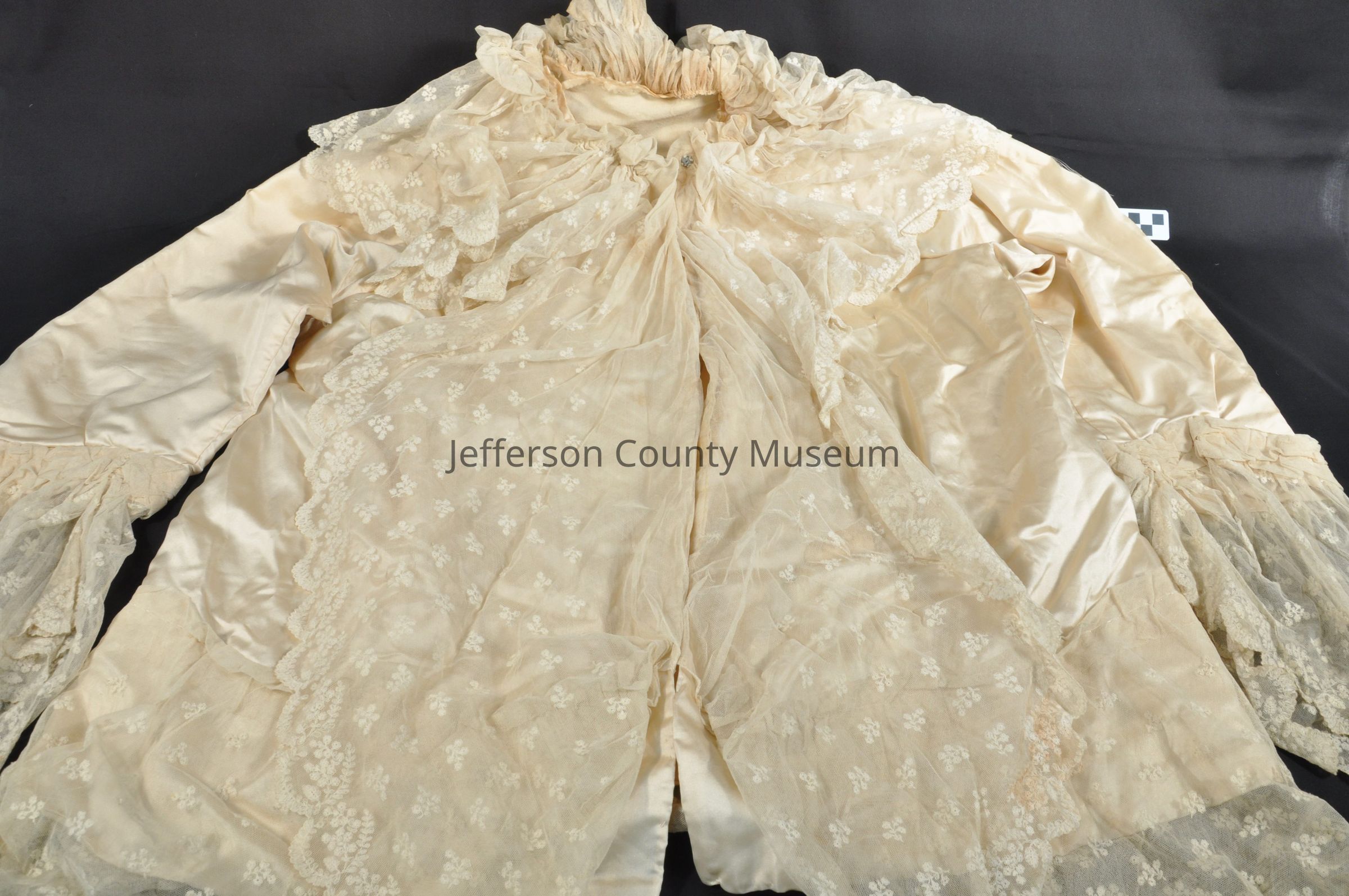 Cream silk and lace jacket. Long lace attachment is continuous around collar, front and bottom. Also has long lace cuffs. Snap closure at top.Acquisition