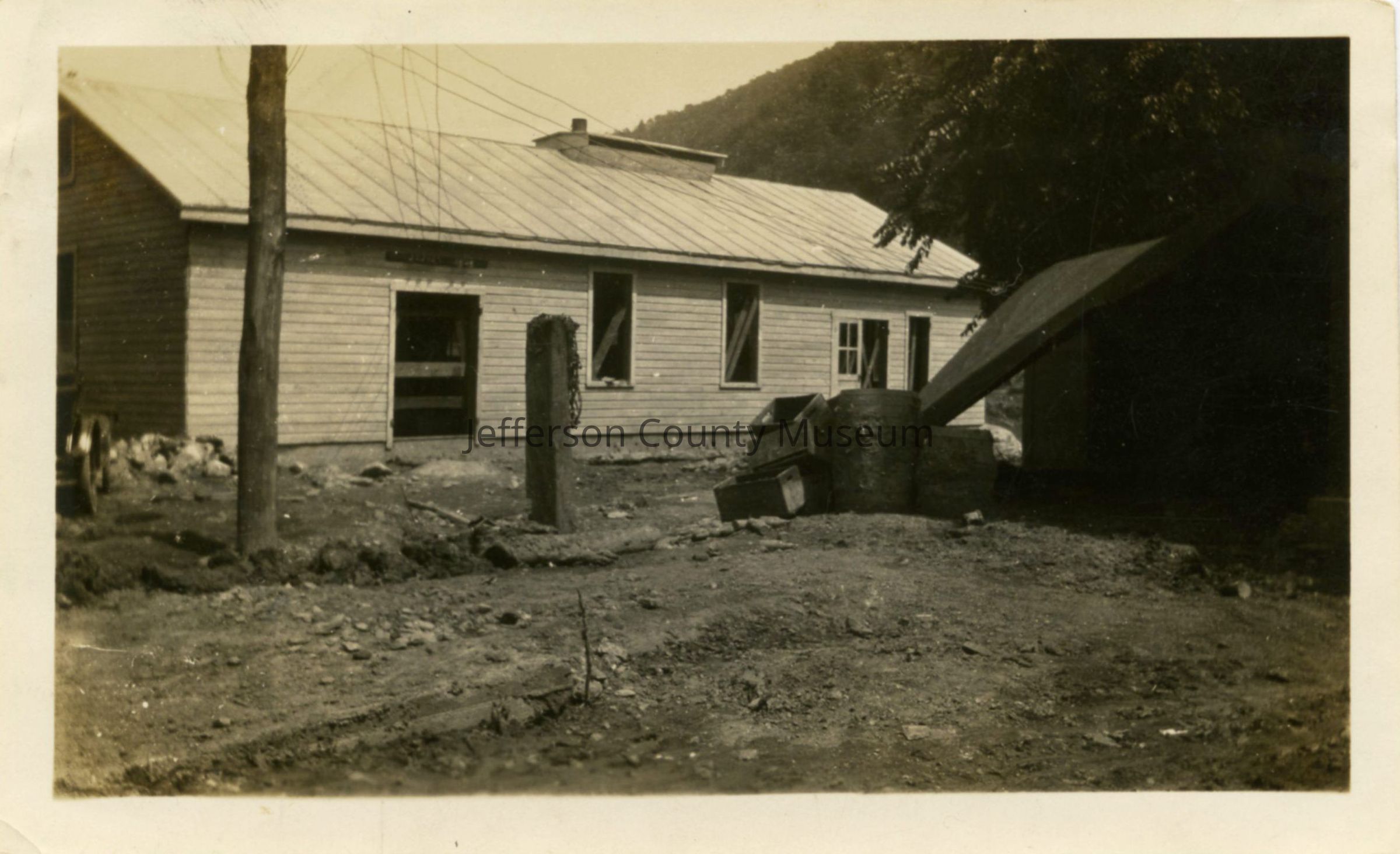 Black and white photo of creamery at Harpers Ferry. Debris is in the foreground and there is visible damage to windows and doors. Note on back says "Creamery after water went down, May 13, 1924."Acquisition