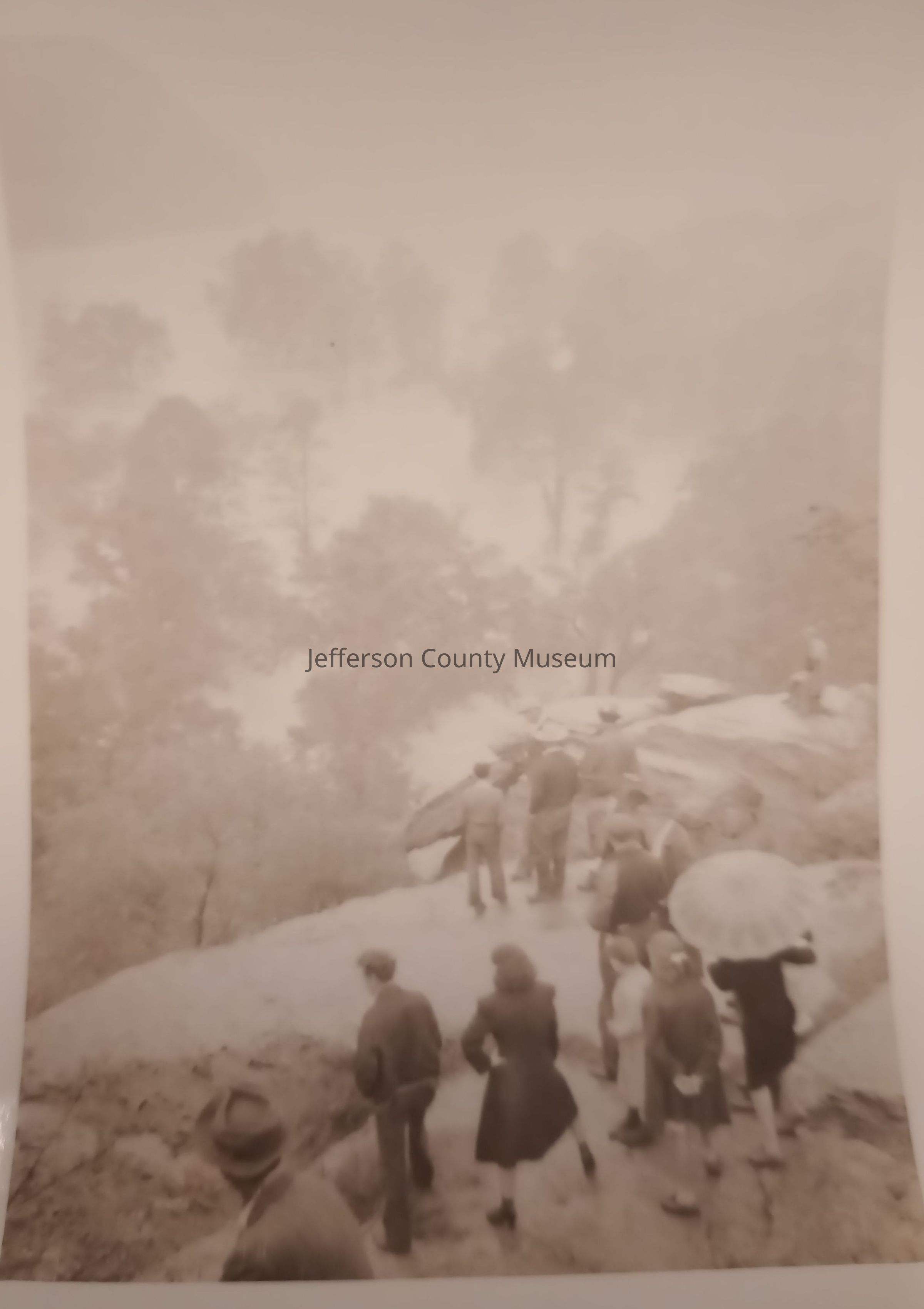Black and white photograph of a crowd of men and women, one with an umbrella, standing near Jefferson Rock, looking down on the 1942 flood.Photograph Details