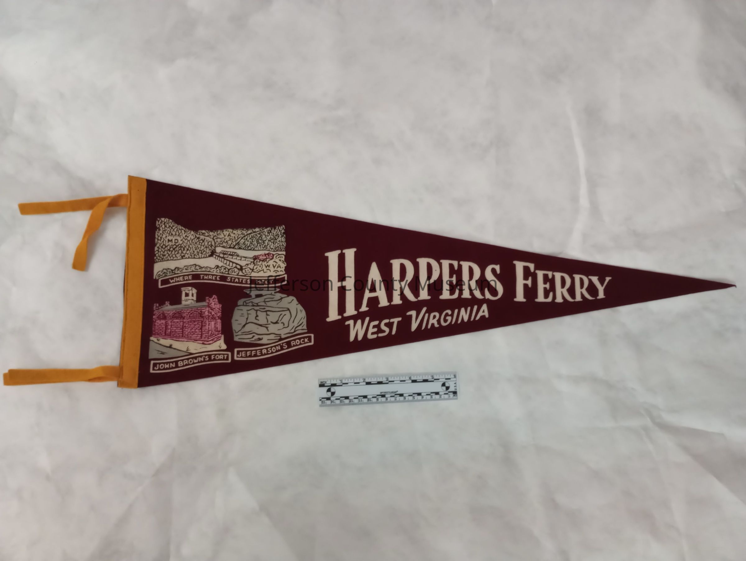 Maroon and yellow felt pennant flag with white letters reading "Harpers Ferry Harpers Ferry" with images of sites to visit in the town captioned "Where three states meet", "John Brown's Fort", and "Jefferson's Rock".Acquisition