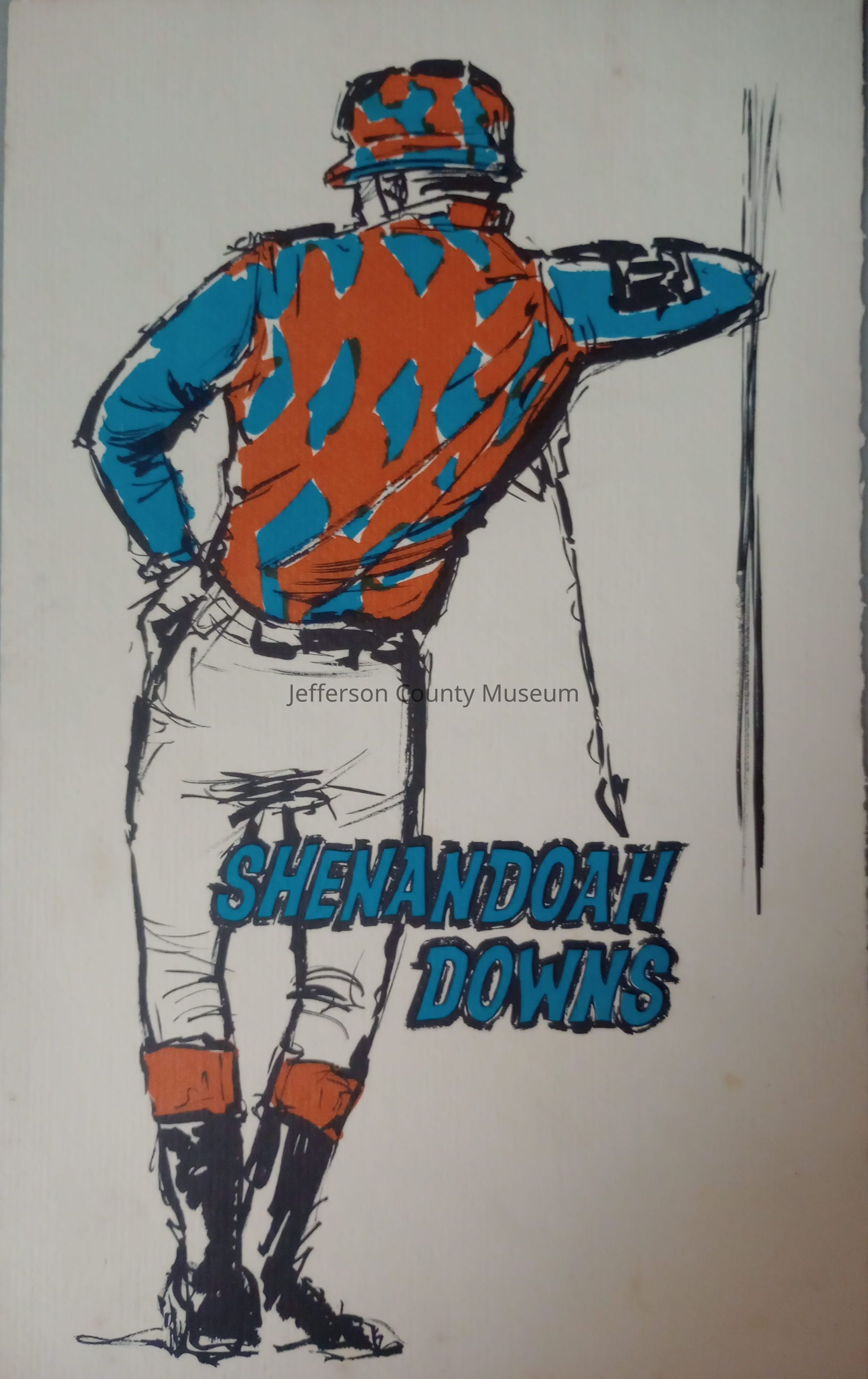 Menu from the Starlight Terrace restaurant at Shenandoah Downs. Cover features a jockey with blue and orange silks posing from behind. Interior features menu options with prices for food and beverages being served at that time.